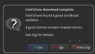 As for being able to back out after viewing the log, I always check and do occasionally have to cancel. I just hate to do that because then I have to run all of the other stories in the group again, downloading any new chapters a second time. Thanks again for your help! - Andrew |