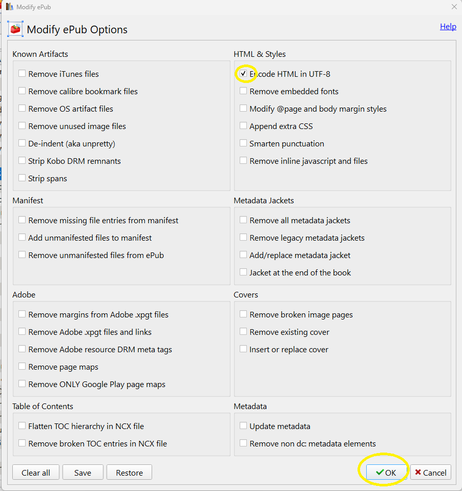 @DNSB instructed me to "turn off all the options except Encode HTML in UTF-8". How do I do that? In other words, where do I find those options? I looked under Calibre > Preferences > Plugins > Modify Epub > Customize Plugin, but it didn't see anything about encoding in UTF-8. It just asked me if I want to be prompted to save epubs. I also looked under Calibre > Preferences > Output Options > Epub Output, but didn't see anything about encoding in UTF-8. Also, once I change those options, how do I apply them to an existing epub? |