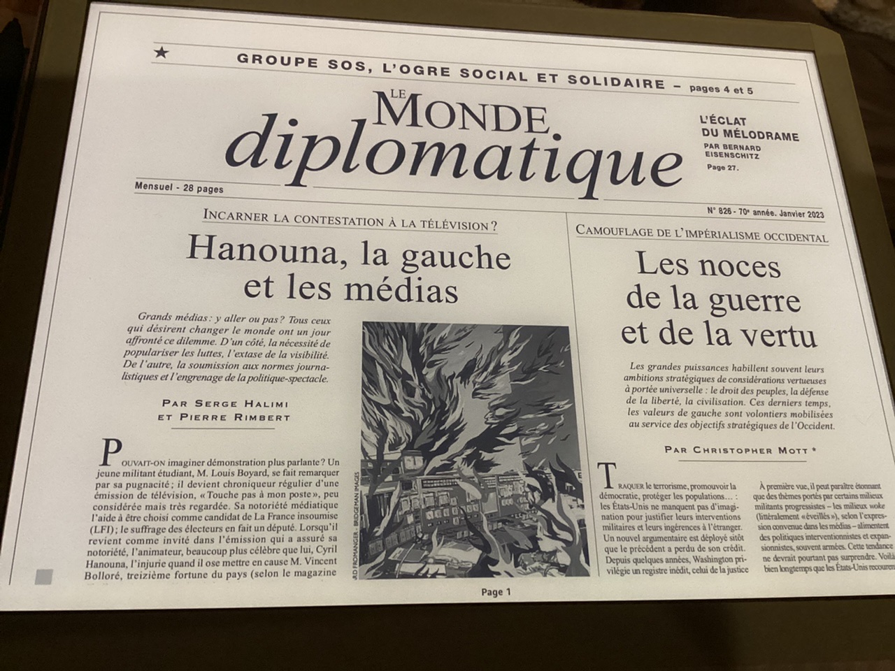 Thanks so much for this. I just subscribed to the French version. I sideloaded both the azw3 and PDFs as send to kindle does not work with azw3 and the writeable PDF that sending wirelessly provides is too faint. The sideloaded azw3 and PDF look really great. The epub would not work with send to kindle. It’s great that they have provided so many versions. I’ve attached pictures - the first one is of an article in the azw3 file, the others are all from the PDF. I think it looks wonderful, and wish I could do this for my regular newspapers. Good for Le Monde Diplomatique. Now to find out if Le Monde itself does anything like this. ETA: It doesn’t.