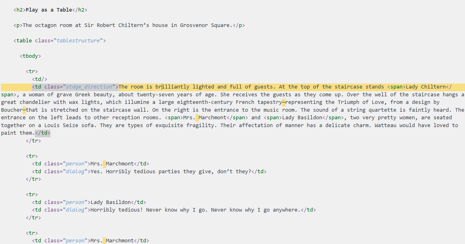 <table class="tablestructure"> <tbody> ... <tr> <td class="tabledatacell persona" epub:type="z3998:persona"><abbr>Mrs.</abbr>*Marchmont</td> <td class="tabledatacell">Going on to the Hartlocks’ tonight, Margaret?</td> </tr> ... </tbody> </table> I'm also going to try converting part of that play over to a description list and see if it makes any difference to editor readability. But, at a guess, structurally, it will look just about the same as the table. The only difference will probably be in the syntax. Last edited by enuddleyarbl; 02-02-2023 at 11:11 AM. |