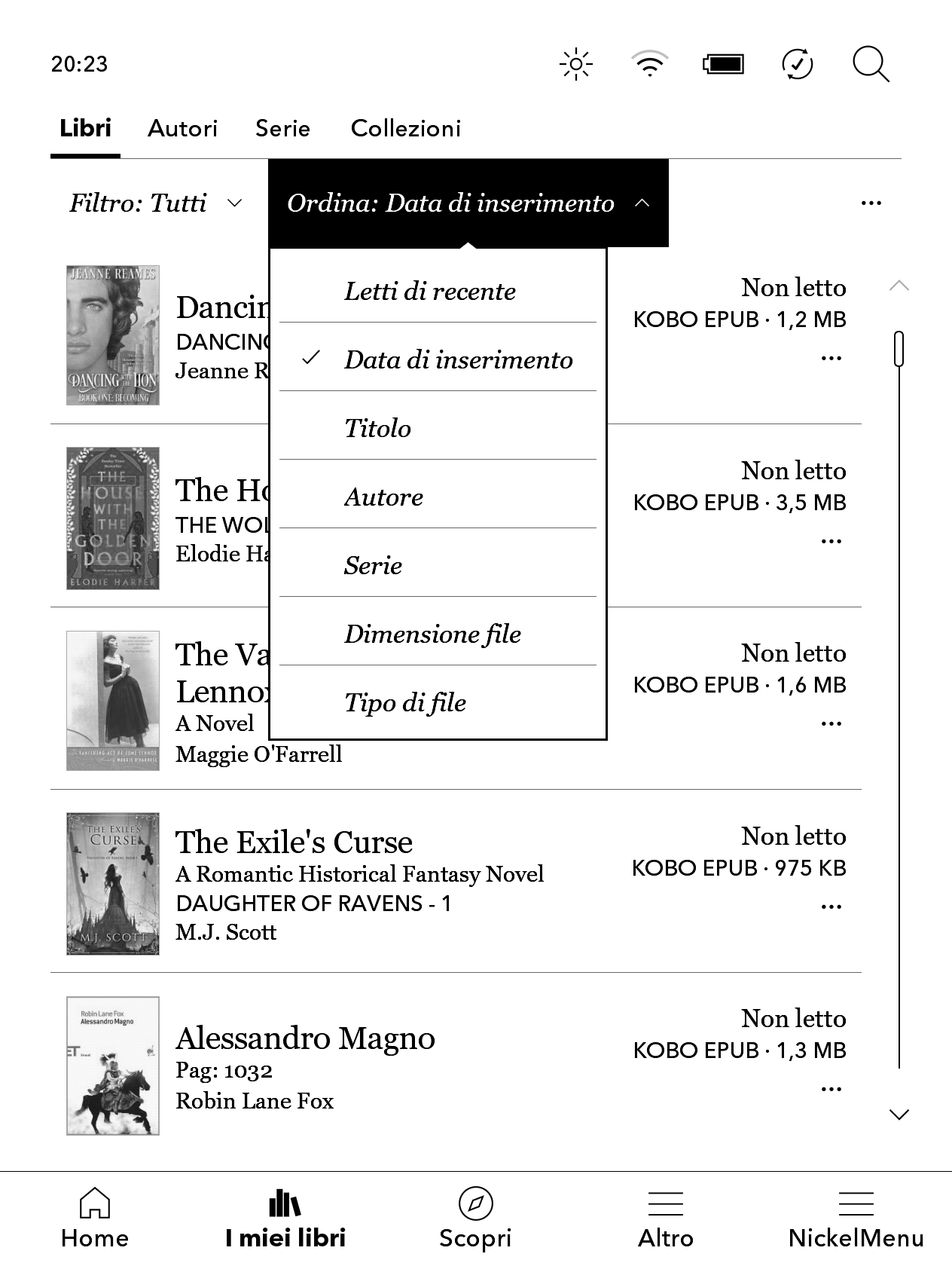 1) Home layout can't be changed (afaik). You basically have the top row with the books you are reading, then a section under that links to your books (on the left), and to the last collection/series/author you opened (on the right). Below that you have two links to the Kobo shop page and the other does change showing different Kobo services (once it linked to something else, but I can't remember, tbh lol) The footer has quick access to your library, your services over wifi (Shop, Overdrive, Dropbox if it's supported for your device/country), the menu (Altro) to access the configuration for the device, and finally NickelMenu is not something out-of-the-box, but it's a very nice tool you can install and that allows you to access to functionality not available by default on your device (Dropbox for Libra, for example), or to enable in a more quick way functionalities that are available but that requires multiple taps or to play around with the config file (screenshots, custom screensavers if you don't want to display the cover of the book you are reading and so on) That's all for library management, I think (as you can see, I use as subtitles the # of pages that the Count Page plugin gives me) ![]() And yes, collections can be whatever you want (one or more calibre columns, regular or custom ones), and you can change them whenever you want because the driver has a nice option to delete empty collections The only limitation I'm aware of is that if you want to use wifi and sync if you have a lot of collections (70+), the sync process can get struck. |
