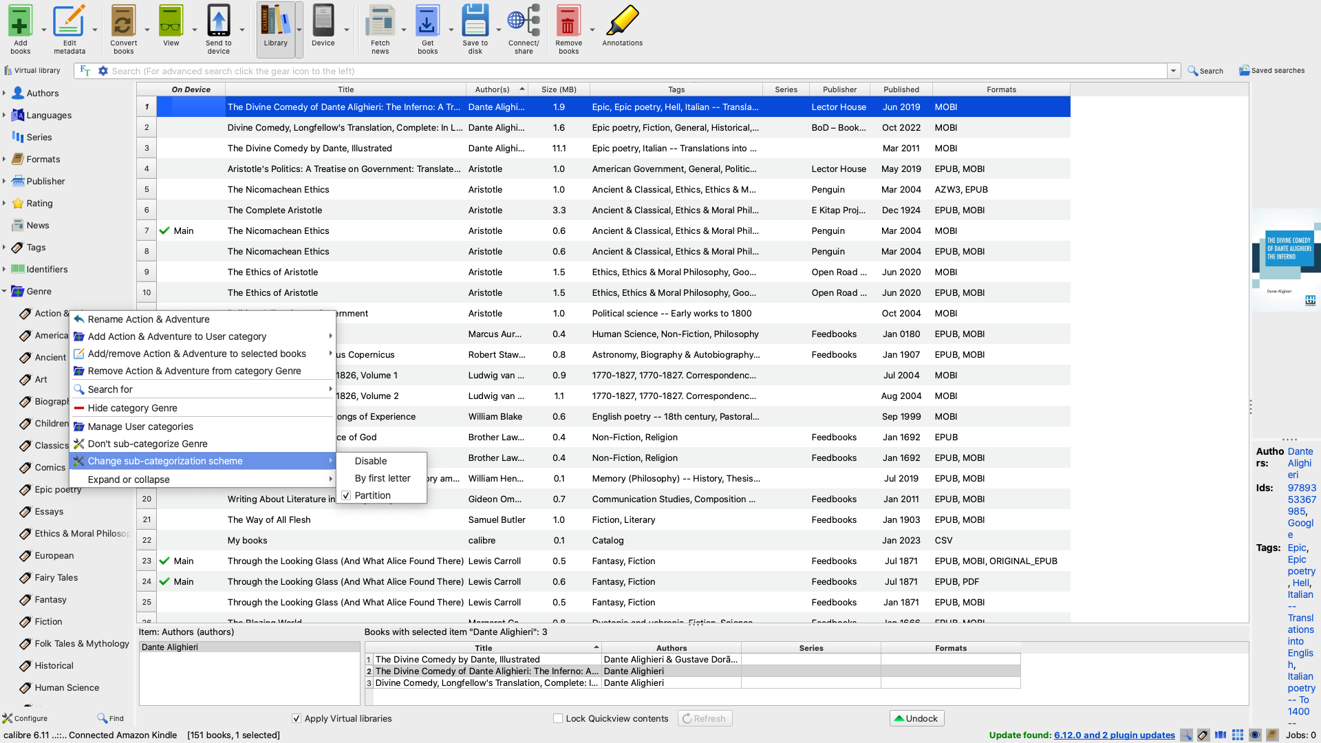 I have a few followup questions. 1) Does the updating involve the searching and confirmation of ebook metadata? And if "what you see is only added to exported books," does this mean that the changes that occur aren't visible within Calibre's library? [I have attached shots of the error message I am still getting.] 2) I figured this issue out. But for a book record that contains multiple formats, is there a way to manually select which format is exported to a device separately from the automated settings that are set up globally within Calibre? 3) I'm definitely still confused on this issue. I have attached some screenshots showing the displayed options within settings as well as the right-click options within the Genre tags section in the sidebar. Does "partitioning" refer to the changes in subcategorization within the file hierarchy (genres: non-fiction: science, history, etc.)? What does the "excepted" setting do? And when would it be helpful to change the subcategorization theme? (Would the latter command help me set up deeper tiers within the Genre tags section?) [I have attached shots of the views I am seeing within Preferences as well as the sidebar.] 4) Am I right in assuming that if I move the default location for the Calibre library, I can rename it whatever and place it wherever I'd like? Is there a best practice to adhere to other than locking the drive? |