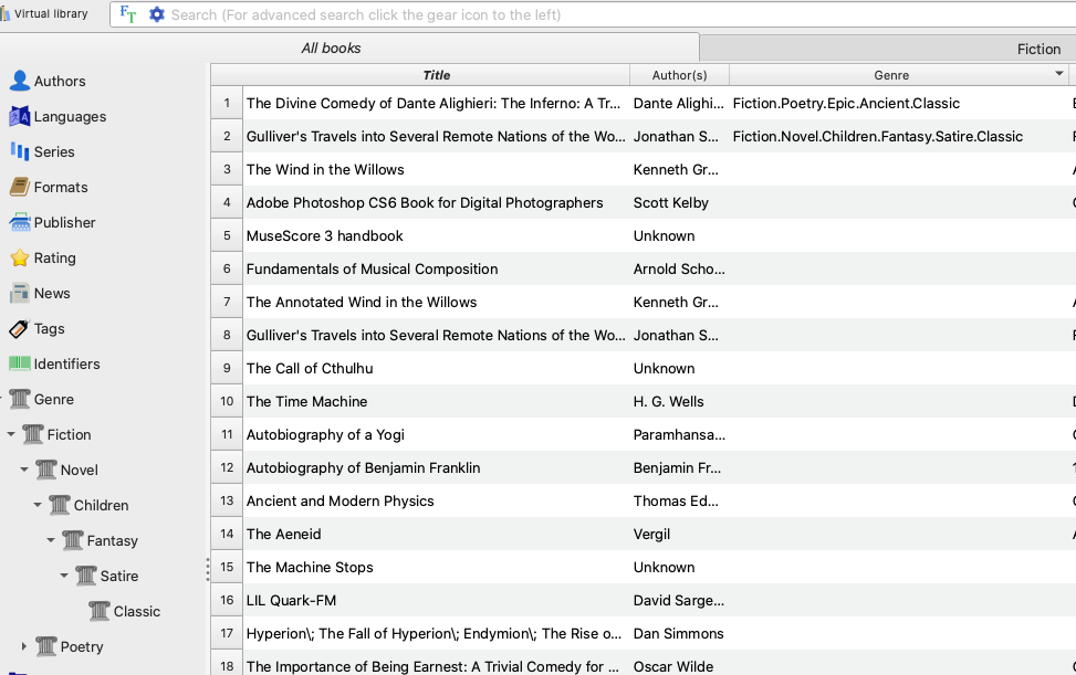 I am trying to better understand the Calibre design behind the virtual libraries and tags. 1) Is it possible to nest virtual libraries within each other, creating a hierarchy of tiered virtual libraries within a single, shared virtual library? For example, if I begin with one main root virtual library entitled Non-Fiction, could I then create sub-libraries within it: 1) History; 2) Science; 3) Philosophy; 4) etc? 2) Am I correct in my understanding that tags cannot be nested within each other? Do tags all exist on the same hierarchical level? 3) Are tags considered metadata? Is there a find-and-replace command within Calibre that might help me better manage the metadata -- including automated tags that I would like to reword (often resulting from Calibre's metadata searches)? 4) Does anyone have any overall comments or suggestions for best practices in setting up detailed virtual libraries and customized tags? I am especially interested in defining tags for genres in a way that can be organized into tiers, if that is possible. Thanks for your help! |