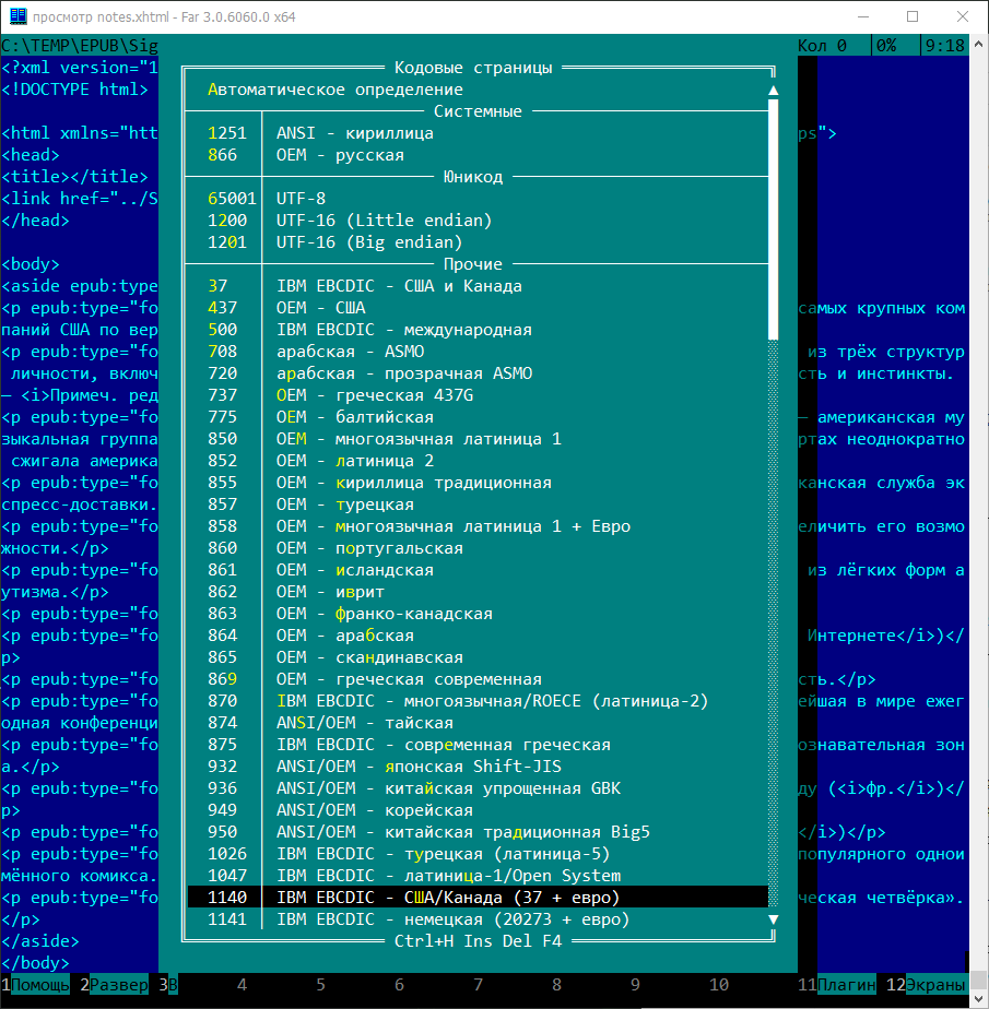 Попробуйте другие варианты для изменения кодировки текста или кодовой страницы. Например: - Измените кодировку в Блокноте. Там это называется "Набор символов" в настройках шрифта (программа, скрин которой вы показали сначала); - загрузите ваш текстовый файл в Notepad++ и попробуйте в меню "Кодировки" установить правильную; - откройте текстовый файл для редактирования в Far Manager и по "Shift+F8" тоже попробуйте установить правильную. Выглядит приблизительно так: |
