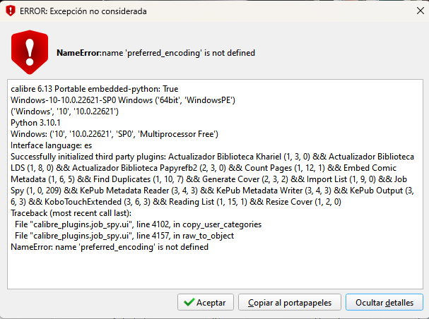 I was using the Enhancements to GUI Tool 'Copy User Category to Target Library' and it got some errors. - If I try to copy only one category, doing it in the usual way, I get the error that corresponds to the image "Error 1" - If I try to use the tool from any library other than my main library, I get the error that corresponds to the image "Error 2" This same error occurs even from a clean installation of Calibre. Job Spy's settings are by default. For some reason it only works from my main library, and only new options, checkbox checked or not. Some of my libraries have different structures, but it also doesn't work on libraries that have the same structure as the main one. Sorry, as a beta tester I suck