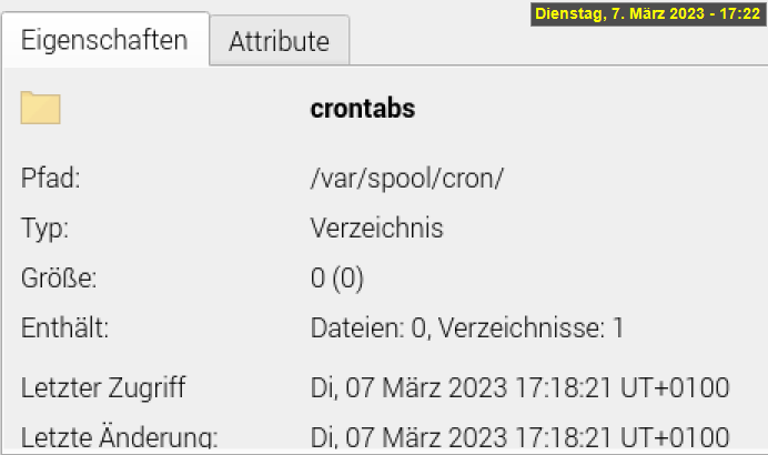 Yes, removed the # In terminal after your command appears: huber70@raspberrypi:~ $ sudo ls -l /var/spool/cron/crontabs insgesamt 4 -rw------- 1 huber70 crontab 1222 7. Mär 17:18 huber70 huber70@raspberrypi:~ $ crontabs folder is not accessable, still contains nothing (see pic above) |