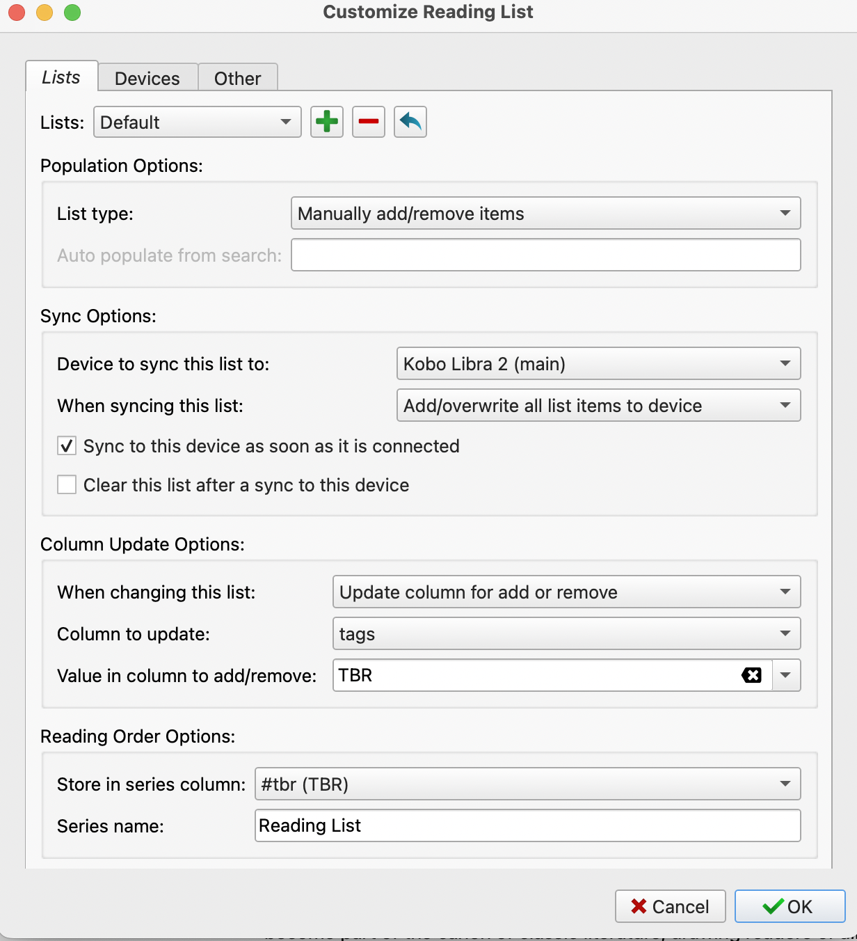 If it IS also supposed to show on the device, I have attached a screenshot of my settings for this plugin, in case anyone is able to tell me what I need to do to make it show up on my Kobo too. I did make a second custom series column named "tbr". I was hoping there was some way to add the reading list as a collection/shelf on my kobo, but have it still be in order. Thanks! Last edited by Lily7; 08-09-2023 at 04:57 PM. |