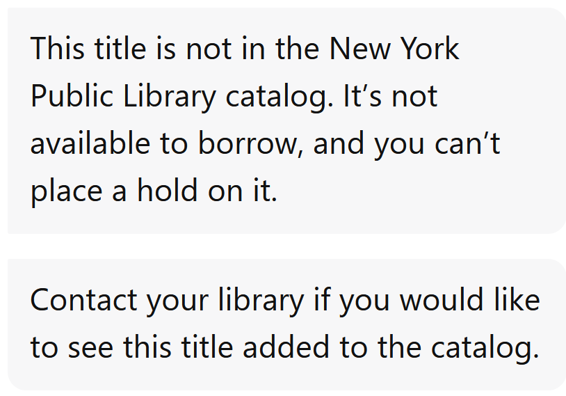 I'm using the website, and I don't see the bell. Is it because one of my libraries already has the title in its catalog? The problem is that one one of my libraries buy copies far ahead of release date (there are currently some for September), so I'm guessing the bell doesn't appear for any of the libraries because I can place a hold at 1 of my libraries. I attached some screen shots. For me, Libby is a case of 1 step forward, 3 steps back. |