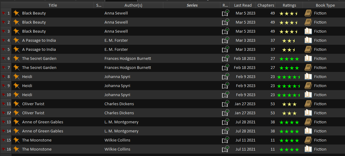 Some years ago I merged up my physical catalog (3555 books) into my Calibre catalog. I wanted to ensure the actual paper ISBN remained uncorrupted, so I added a "paperisbn" column. (Also, though not perfectly maintained, I also have a "PBook" tag, and for many, a shelving location tag. #paperisbn:true is the absolute source of truth, though.) Today, if I have a digital copy as well (about 1500 of those), I've got it in a separate row -- but then attributes that are more about the work vs. the instance. e.g. read flag, rating, etc., are harder to maintain, sort, etc. Wondering if any of you have experience with merging or not-merging this sort of catalog entry, or thoughts on what I might gain or lose. Thanks.  |