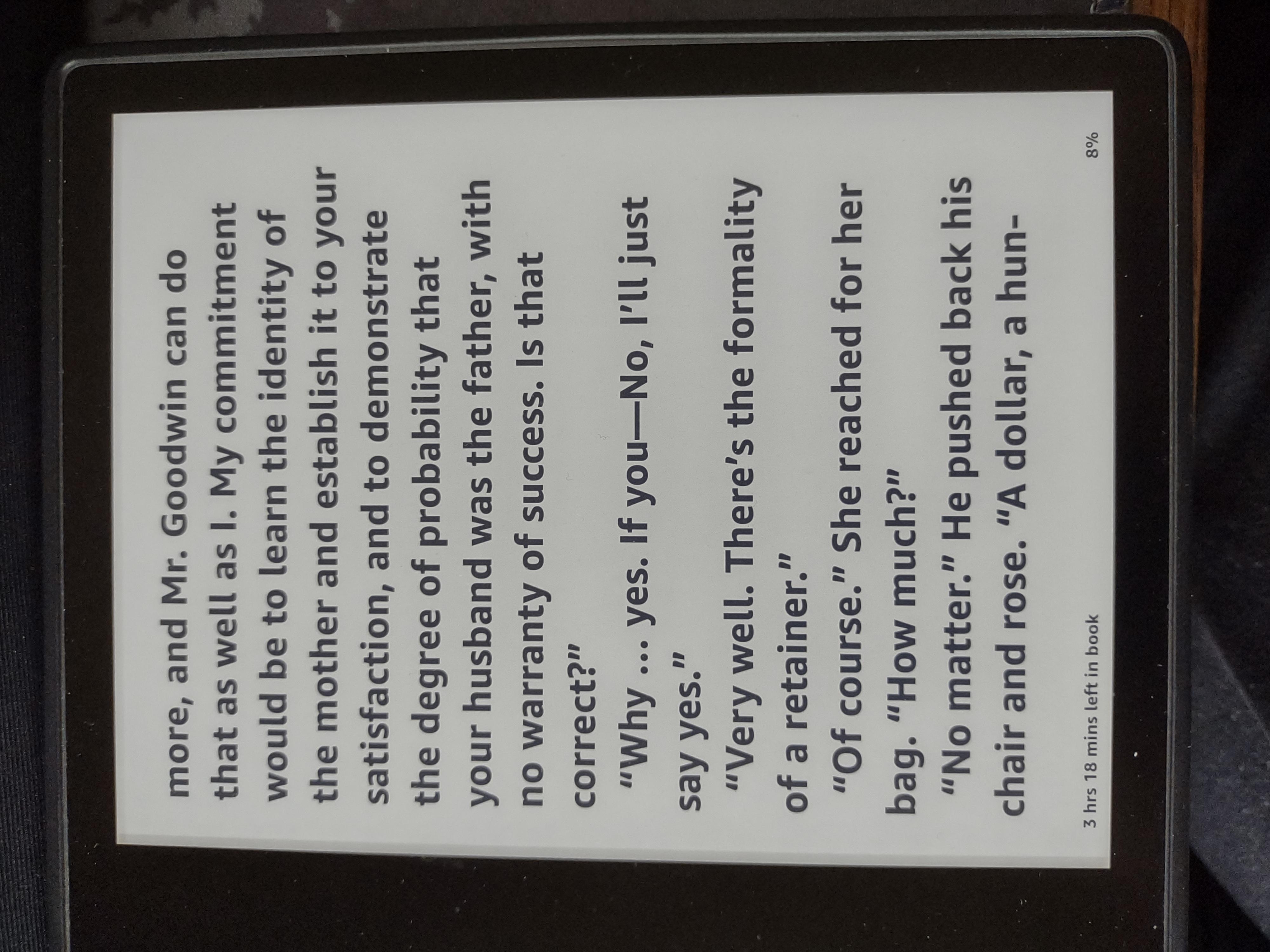 With the official sleepcover (which I sometimes take off if I'm reading for a long while)I almost always use Bookerly font, chapter title and pages left in chapter up top, % left in book on the bottom (when the book title isn't super long...), left justification, and NickelClock in the upper left so I can always see the time. I also always have the warm light about ~75% between cool and warm light, and brightness usually 5-10% depending on time of day |