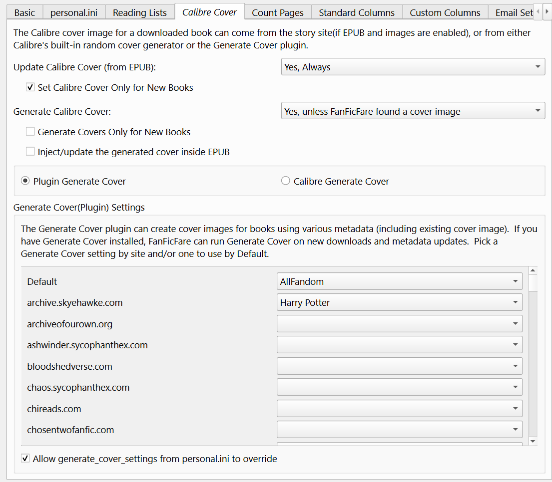 make_firstimage_cover: false In the "Generate Calibre Cover:" settings I'm now using "Yes, unless FanFicFare found a cover image." I attached a new screenshot. Thanks for pointing me towards the wiki. Amalthia EDITED: I think ultimately the solution was using this code in personal.ini Code: