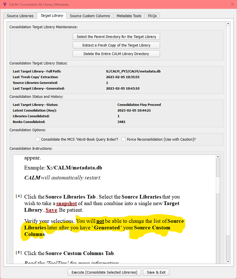 Anyways, so far so good on the get custom columns button, NO error popups and the log says all good in attach, so it seems to be working All of the test libraries show up, with their custom columns.Here's the log, in case I missed something: susan@localhost:~> calibre-debug --gui calibre 6.11 embedded-python: False Linux-6.1.8-1-default-x86_64-with-glibc2.36 Linux ('64bit', 'ELF') ('Linux', '6.1.8-1-default', '#1 SMP PREEMPT_DYNAMIC Tue Jan 24 06:29:25 UTC 2023 (baebfe0)') Python 3.10.9 Interface language: None Successfully initialized third party plugins: Consolidate All Library Metadata (2, 0, 45) && Job Spy (1, 0, 202) && MultiColumnSearch (1, 0, 96) && View Manager (1, 10, 2) QPA platform: xcb devicePixelRatio: 1.0 logicalDpi: 96.0 x 96.0 physicalDpi: 102.23899371069182 x 102.35820895522387 ApplicationPaletteChange event ignored Using calibre Qt style: True [0.00] Starting up... [0.00] Showing splash screen... [0.03] splash screen shown [0.03] Initializing db... [0.04] db initialized [0.04] Constructing main UI... Screens currently in system: {'depth': 24, 'device_pixel_ratio': 1.0, 'geometry_in_logical_pixels': {'height': 1080, 'width': 1920, 'x': 0, 'y': 0}, 'index_in_screens_list': 0, 'manufacturer': 'ViewSonic Corporation', 'model': 'VX2250 SERIES', 'name': 'DVI-I-1', 'serial': 'RWS102406078-', 'size_in_logical_pixels': {'height': 1080, 'width': 1920}, 'virtual_geometry': {'height': 1080, 'width': 1920, 'x': 0, 'y': 0}} Restoring geometry for: calibre_main_window_geometry {'frame_geometry': {'height': 1036, 'width': 1920, 'x': 0, 'y': 0}, 'full_screened': False, 'geometry': {'height': 1005, 'width': 1920, 'x': 0, 'y': 31}, 'maximized': True, 'normal_geometry': {'height': 1005, 'width': 1920, 'x': 0, 'y': 31}, 'screen': {'depth': 24, 'device_pixel_ratio': 1.0, 'geometry_in_logical_pixels': {'height': 1080, 'width': 1920, 'x': 0, 'y': 0}, 'index_in_screens_list': 0, 'manufacturer': 'ViewSonic Corporation', 'model': 'VX2250 SERIES', 'name': 'DVI-I-1', 'serial': 'RWS102406078-', 'size_in_logical_pixels': {'height': 1080, 'width': 1920}, 'virtual_geometry': {'height': 1080, 'width': 1920, 'x': 0, 'y': 0}}} Matching screen: {'depth': 24, 'device_pixel_ratio': 1.0, 'geometry_in_logical_pixels': {'height': 1080, 'width': 1920, 'x': 0, 'y': 0}, 'index_in_screens_list': 0, 'manufacturer': 'ViewSonic Corporation', 'model': 'VX2250 SERIES', 'name': 'DVI-I-1', 'serial': 'RWS102406078-', 'size_in_logical_pixels': {'height': 1080, 'width': 1920}, 'virtual_geometry': {'height': 1080, 'width': 1920, 'x': 0, 'y': 0}} Setting widget geometry to: {'height': 1005, 'width': 1920, 'x': 0, 'y': 31} Restoring widget to maximized CALM: initialization_complete............ Job Spy has begun initialization... Calibre, and hence Job Spy, was gracefully shut down last time? True Last time daemon started: never Last time daemon failed: never Total daemon starts inception_to_date: 0 Total daemon failures inception-to-date: 0 qt.gui.imageio: libpng warning: iCCP: known incorrect sRGB profile JS: ===>>> change_gui_alternating_row_colors() Job Spy has finished initialization... [0] un-optimized number of undesirable characters accumulated: 756 [1] optimized number of undesirable characters accumulated: 596 MCS has finished initialization... [1.60] main UI initialized... [1.60] Hiding splash screen Starting QuickView [1.75] splash screen hidden [1.75] Started up in 1.75 seconds with 467 books CALM_DB_VERSION_METADATA_DB 2 CALM_DB_VERSION_METADATA_TOOLS_DB 2 CALM_DB_VERSION_UPGRADE_FORCE_UPGRADE False CALM_DB_VERSION_UPGRADE_SUPPRESS_INFO_DIALOGS False CALM_FORCE_RECONSOLIDATION False CALM_LAST_CONSOLIDATION_JOB_DATETIME ...NEVER... CALM_LAST_CONSOLIDATION_NUMBER_BOOKS 0 CALM_LAST_CONSOLIDATION_NUMBER_LIBRARIES 0 CALM_LAST_CONSOLIDATION_TARGET_DB_FULL_PATH ZZ: CALM_MCS_INDEX_CONSOLIDATION False CALM_TARGET_DB_FULL_PATH /home/susan/Calibre/CALM/metadata.db CALM_TARGET_DB_GENERATING_NONCALM_LIBRARY_PATH ZZ:||>>>||ZZ: CALM_TARGET_DB_LAST_CHOSEN_LIBRARY_DIRECTORY ZZ: CALM_TARGET_DB_MUST_BE_REFRESHED False CALM_TARGET_PARENT_DIRECTORY /home/susan/Calibre CALM_USER_STATUS USER Number of keys in self.mysourceprefs in 'load_source_prefs_init' : 128 Number of keys in self.mysourceprefs in 'load_source_prefs' : 128 my_db.library_path: /home/susan/Calibre/LanguageandWriting self.target_db: /home/susan/Calibre/CALM/metadata.db filesystem_encoding is: utf-8 filesystem_encoding is: utf-8 Attaching to Tools DB: /home/susan/Calibre/CALM/metadata_tools.db n_tools_size = os.path.getsize(tools_path): 2260992 Number of keys in self.myparentprefs in 'child_invocation_of_save_real_prefs_parent' : 128 LIBRARY_PATH_03 : /home/susan/Calibre/LanguageandWriting LIBRARY_PATH_04 : /home/susan/Calibre/New Library LIBRARY_PATH_05 : /home/susan/Calibre/NewBooksForCalibre LIBRARY_PATH_06 : /home/susan/Calibre/Testlibrary number_source_libraries: 4 n_last_to_show: 6 n_tools_size = os.path.getsize(tools_path): 2260992 filesystem_encoding is: utf-8 metadata_tools.db is good to go. CALM_DB_VERSION_METADATA_DB 2 CALM_DB_VERSION_METADATA_TOOLS_DB 2 CALM_DB_VERSION_UPGRADE_FORCE_UPGRADE False CALM_DB_VERSION_UPGRADE_SUPPRESS_INFO_DIALOGS False CALM_FORCE_RECONSOLIDATION False CALM_LAST_CONSOLIDATION_JOB_DATETIME ...NEVER... CALM_LAST_CONSOLIDATION_NUMBER_BOOKS 0 CALM_LAST_CONSOLIDATION_NUMBER_LIBRARIES 0 CALM_LAST_CONSOLIDATION_TARGET_DB_FULL_PATH ZZ: CALM_MCS_INDEX_CONSOLIDATION False CALM_TARGET_DB_FULL_PATH /home/susan/Calibre/CALM/metadata.db CALM_TARGET_DB_GENERATING_NONCALM_LIBRARY_PATH ZZ:||>>>||ZZ: CALM_TARGET_DB_LAST_CHOSEN_LIBRARY_DIRECTORY ZZ: CALM_TARGET_DB_MUST_BE_REFRESHED False CALM_TARGET_PARENT_DIRECTORY /home/susan/Calibre CALM_USER_STATUS USER Number of keys in self.mysourceprefs in 'load_source_prefs_init' : 128 Number of keys in self.mysourceprefs in 'load_source_prefs' : 128 my_db.library_path: /home/susan/Calibre/LanguageandWriting self.target_db: /home/susan/Calibre/CALM/metadata.db Number of keys in self.mysourceprefs in 'save_sour