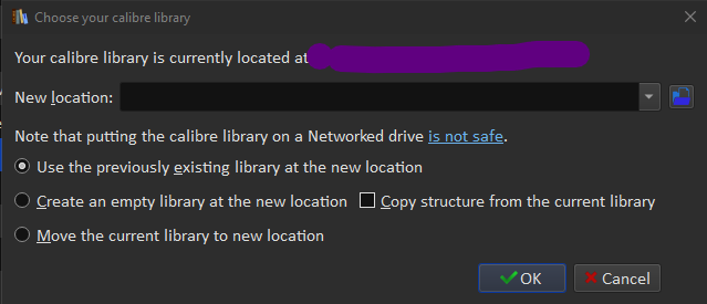 I have two libraries - my book library and my knit/crochet pattern library. I had to do a Windows recovery/reset/whatever it's called yesterday, so Calibre doesn't 'know' about the second library yet. But, when I click on the "Switch/Create Library" I don't see an option that feels "safe" to me. With many many hours in curating both libraries, I'm a little terrified of effing up. I obviously must have succeeded when I created the second library... so what am I mis-reading? Below the location bar, I see 3 options: Use the previously exiting library at the new location Create an empty library at the new location (option: copy structure from the current library) Move the current library to a new location. I just need to tell Calibre - hey, this library exists, too. Both libraries are in the same folder, if that helps. I couldn't find anything on keeping multiple libraries (note: NOT virtual libraries here) in the manual. As I said in another post today -- I'm probably just not seeing it (dialogue fatigue? Is that a thing? lol) As soon as I figure this out, I'm adding it to my SOP for reinstalling Windows! Anne |