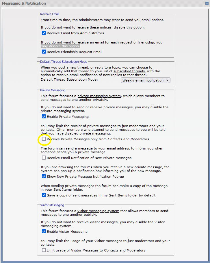 User Control Panel => Settings & Options => Edit Options => Messaging & Notifications => Private Messaging, remove the checkmark from Receive Private Messages only from Contacts and Moderators See the attached image. |