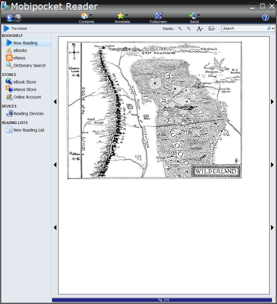 The images are vastly different in size. The ePub and LIT versions have very large images, the largest is the Map of Wilderland, which is 1,547KB and 1600x1258. The MOBI version is 81KB and 586x481. The eReader version is smaller still, 38KB and 360x282. The ePub version resizes to fit the screen, so it is probably an image inside a SVG. The PDF version is across 2 pages, and unfortunately the double page ADE option does not show both pages of the figure.
