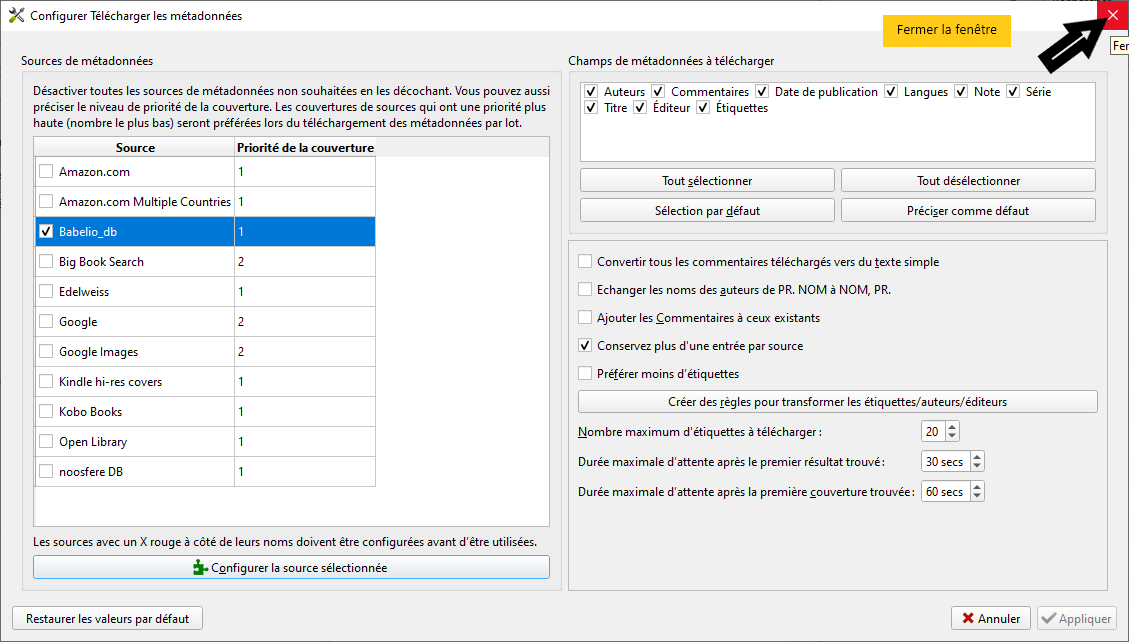 timing of the accesses to Babelio for this book When : Thu Jun 1 17:52:15 2023; Who : [__init__]; Where : https://www.babelio.com/resrecherche.php?Recherche=claire+garand+paideia&tri=auteur&item_recherche=livres&pageN=1 When : Thu Jun 1 17:52:17 2023; Who : [worker 0]; Where : https://www.babelio.com/livres/Pyatt-Confessions-du-pas-siGrand-Mechant-Loup/266290 When : Thu Jun 1 17:52:18 2023; Who : [worker 0]; Where : https://www.babelio.com/aj_voir_plus_a.php When : Thu Jun 1 17:52:19 2023; Who : [worker 1]; Where : https://www.babelio.com/livres/Pyatt-Lenvers-des-contes-tome-2--Journal-du-pas-sig/694328 When : Thu Jun 1 17:52:21 2023; Who : [worker 1]; Where : https://www.babelio.com/serie/Lenvers-des-contes/6316 l'image 8 confirme que c'est la faute à babelio... Faudrait rapporter mais pour le moment je suis (encore) banni à force de tests. Solution Il suffit de rentrer le babelio_id à la bonne place avant de recommencer le téléchargement des métadonnées image 9: copie l'adresse de la page du livre désiré... image 10: Dans le panneau d'édition des métadonnées clique sur la bonn icone pour introduire le Babelio_id (le babelio_id est en fait l'information minimum nécessaire pour reconstituer l'adresse de la page de l'ouvrage) Image 11: gagné... Image 12: Hey... on peut accéder directement a la page, que l'on aie ou non, décidé d'inclure la référence dans les commentaires. |