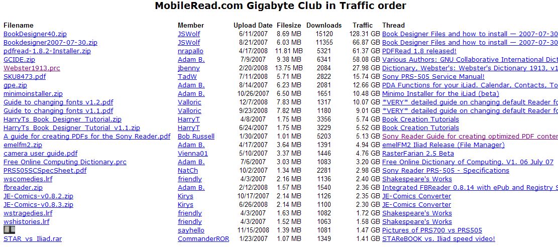 Cumulative these 25 files account for approx. 0.45 TB (Terabyte) in traffic. Shocking to see those traffic/bandwidth results, including my PDFRead installer. Sorry Alex! ![]() I'd hate to see the traffic numbers for the Calibre new release downloads that are hosted on the MobileRead.com servers...
