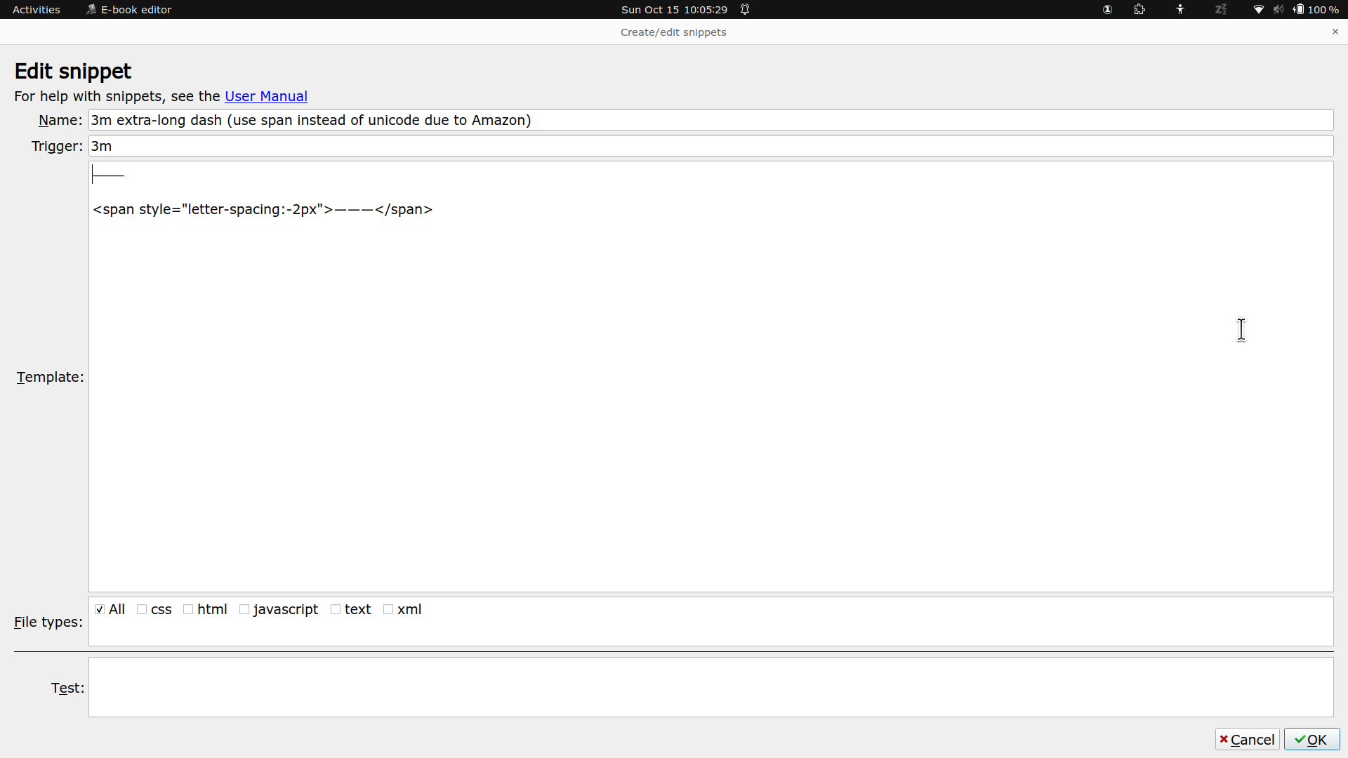 I use en dash and em dash quite a bit. To make them I employ both the calibre snippets and also .XCompose. I found out to my horror from a prior post reply that Amazon will not recognize the em dash, so I fudge it by 'running together' 3 regular dashes with a span whose spacing has been reduced. I use the triple sometimes to surround page numbers at bottom of PDF pages. You can set up an .XCompose file in Home and use it elsewhere (not just calibre tag editor). While in calibre I prefer using snippets for en and em dashes. I break USA convention (if, indeed, those rules still apply) by separating like this: text space en dash space text. That is, I do not allow the en dash to touch text (as is the convention). I find that it is even worse looking when done as follows: text comma en dash space text. This was done frequently a century ago by many authors. Or, maybe the type setter did this. I use the triple dash like this for mid-chapter centered scene breaks: em dash space scene space em dash. Best regards, Pop