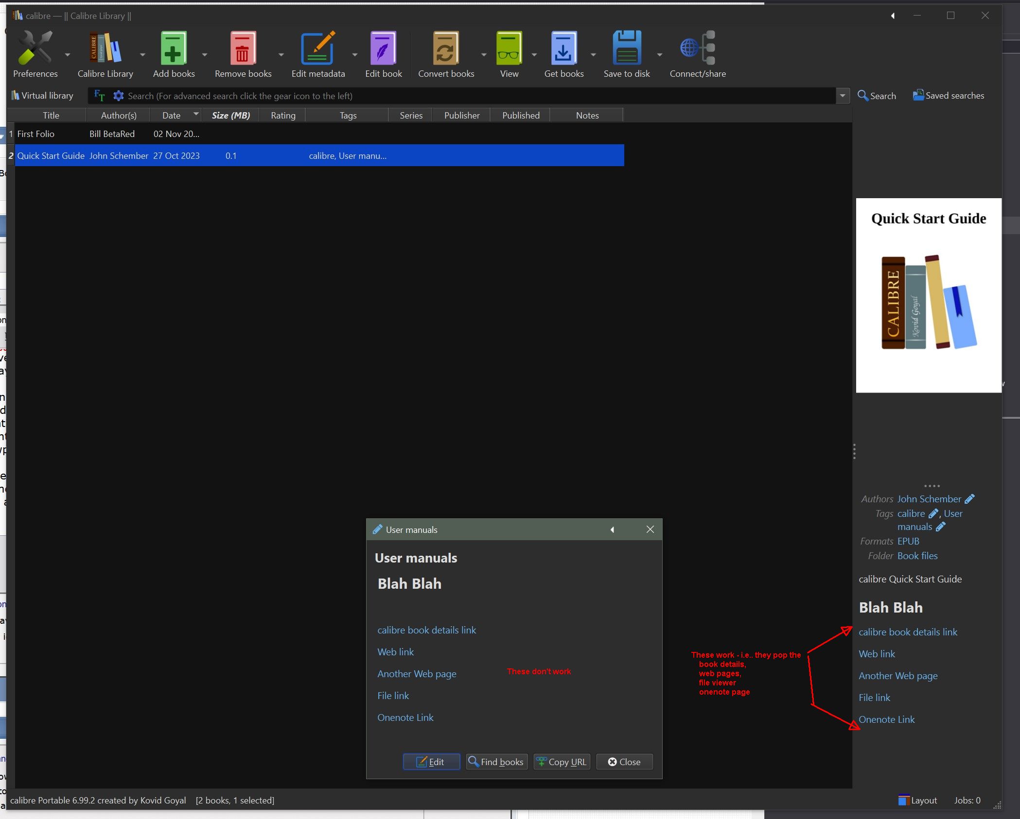 But, in the GUI: Where should I click to activate links that are embedded in a category note. I see a finger cursor in the Category Note Viewer (see Post # 45), indicating the links are 'clickable', but they're not. I know the generated HTML is fine because I can copy the code into a book's Comments and click on the embedded links in its Book Details panel, i.e.: BR Last edited by BetterRed; 11-03-2023 at 06:06 AM. |