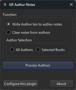 Edit: Updated plugin to manually load the dependencies directly from the zip file without using pip. With the notes feature in Calibre 7, I thought of a new plugin that I knew I would want, so I wrote it and am sharing it here. This plugin pulls author information from GoodReads and writes it to the author note. Everything is organized in a table (see example below) and the background color, border color, and text color can be changed in the plugin configuration. It defaults to the colors shown in the example image. Currently, it uses a Goodreads function that is also used by Calibre to "guess/search" the author page. This is almost always correct, but if you have an author where a more well-known author has the same name as the author of your book. For example, if you have books by South African novelist Peter Abrahams, Goodreads will return American mystery writer Peter Abrahams instead. If the author isn't found or if the author exists in Goodreads, but has no biography information, they will be skipped. Please let me know if you find this useful or have any suggestions. Example: Interface: Configuration: Last edited by azuravian; 11-19-2024 at 02:17 AM. Reason: Updating to v1.2.2 |
