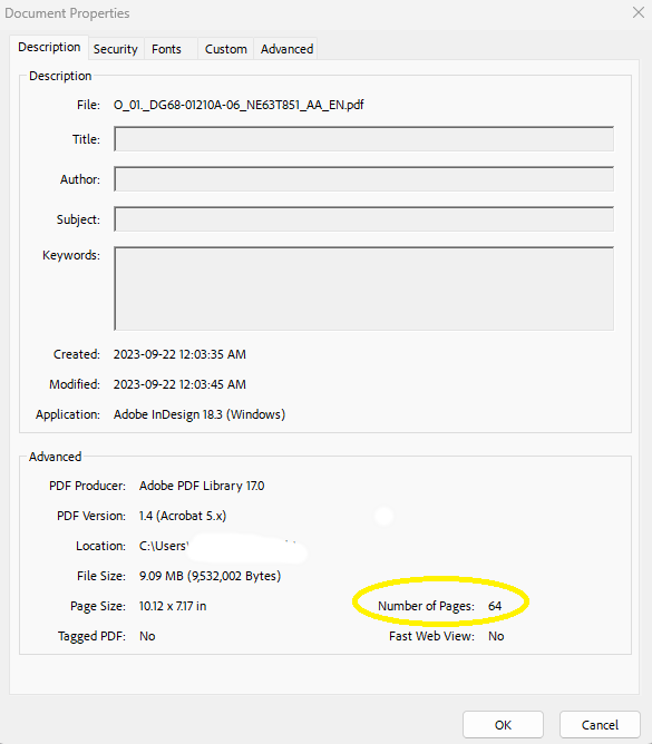 If you are attempting to use the Adobe Synthetic Page count algorithm, it should pop up a message that "WARNING: Page/word/statistics warnings: Could not analyse some statistics" along with a list of the books with "(ADOBE page count requires EPUB format)" None of the other algorithms will help since they are not intended to work with a PDF file. Adobe Reader does not count the # of pages, it uses the number of pages that is part of a PDF documents properties. See sample properties image attached. |