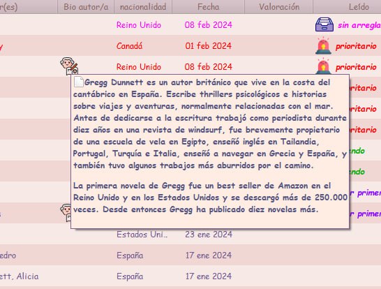 I'll have a play around. I guess the icon and pop up feature will become obvious once I set it up. Also looks like you have to copy the author text to each book? I thought it was a "write once, link automatically to all authors books". Probably easier to write a note against the author, but no idea how to display that in a column in the library list. |