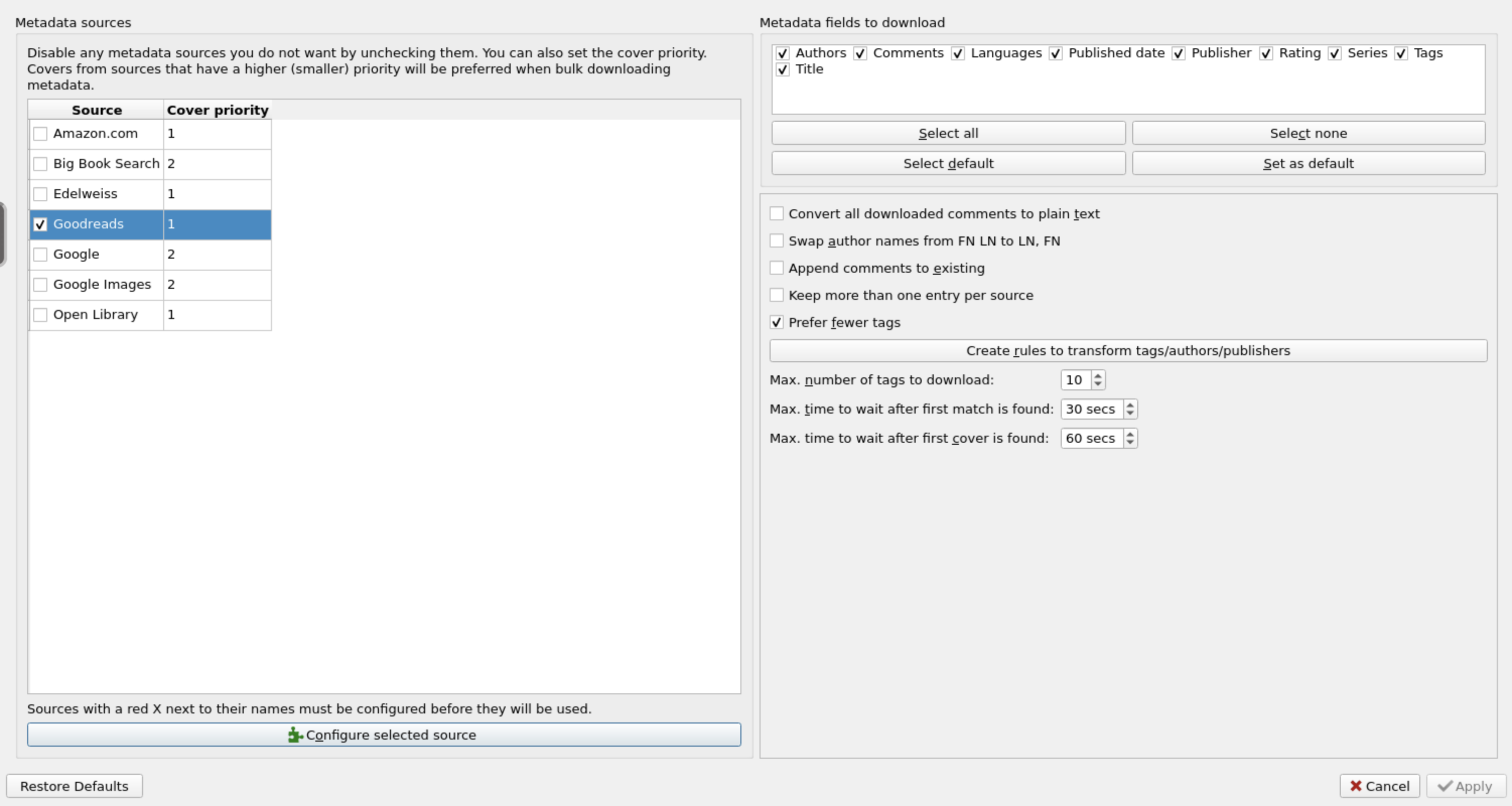 The goal of this post is to provide arguably the best method of organizing your Calibre library without doing any manual classification. It will assign each book to a set of tags, and also assign each book to a single hierarchical genre (how physical book stores classify books). **IMPORTANT: This method will modify your Library irreversibly. You're strongly encouraged to backup your library before proceeding.** Tags & Genres This approach should result in your books having relevant tags, and having genres that a decent book store would place them in. Isaacson's "Benjamin Franklin" would get automatically get placed into Nonfiction.Biography, Frank Herbert's "Dune" would get placed into Fiction.Science Fiction, and so on. ### Background There are two general methods of categorizing information: tags and a genre hierarchical structures. They both have benefits and drawbacks. Tags provide a comprehensive way of assigning all relevant topics to a book. But they can often get disorganized, duplicated and unwieldy. It's not uncommon for people with large libraries to have thousands of inconsistently named tags (sciencefiction, Science Fiction, science-fiction) with many duplicates. Genres on the other hand aim to find the most relevant classification. While the book "Dune" could be accurately tagged "Adventure, Fantasy, Science Fiction, Novels, Space Opera", I think we'd all agree if you had to place it in a single aisle in a bookstore it would be best placed in the "Science Fiction" aisle. This method gives the best of both worlds, multiple tags and a single canonical hierarchical genre. ### Tagging On to the good stuff. First, we'll be using Goodreads as the sole source of tags for books. Goodreads provides the best tagging classification I've yet seen. There is less noise than the publisher provided tags, and tags seem to have been de-duplicated to provide a good starting point for classification. To get started with Goodreads, make sure you have the Goodreads plugin by Grant Drake. **Warning: This method requires you to wipe all your existing tags and rely on Goodreads provided tags.** First we'll be removing all existing tags on your books. #### Removing tags To remove all your existing tags, select all the books you'd like to update, right click context menu -> Edit metadata -> Edit metadata in bulk. Then go to the Basic metadata tab, and click the "Clear all" checkbox to the right of the "Remove tags" input field. Then finally click "OK" to clear the tags from your library. #### Adding Goodreads Tags Select all the books you'd like to update, right click to -> Edit metadata -> Download metadata and covers. The click the "Configure Download" button. Make sure that ONLY the Goodreads source is checked under "Metadata sources". This step is optional, but I prefer to have Goodread's original tags so I click "Configure selected source" for Goodreads, and uncheck the "Filter and map genres to calibre tags" button. While on this screen make sure that the "Tags" checkbox is selected (it should be by default). For the other metadata field you can leave them checked if you want to override your existing library metadata for those fields. Finally, click "Save". I also set the maximum number of tags to 10 (anymore than that for a single book will likely be noise. Here's my configuration: Click "Apply" to update configuration. And then on the Schedule Download page, you can click either "Download only metadata" if you only want metadata, or "Download both" if you'd like to download metadata and cover images from Goodreads. I already had cover images in my library, so I only clicked "Download only metadata" to speed up the process. But if you're missing cover images you might want to grab both. This process will take several minutes for larger libraries as Calibre updates your metadata with tags from Goodreads. Once this is complete, Calibre will ask you if you want to update your library with the metadata. Click "Yes" to agree. This will also take several minutes if you have a larger library. At the end of this process you should have most of your books that could be matched with updated tags from Goodreads. If all you want are clean tags in your library, you can stop the guide here. But if you'd like to classify books by Genre as well, then proceed. ### Auto Genres Now that you have a single source for your tags, the next step is to classify each book into a single hierarchical genre. I prefer to keep genres simple and have only a single level deep for the hierarchy. The top level genre for books will only be one of "Fiction" or "Nonfiction". The next level would be the single most relevant tag. Fortunately, Goodreads tags are returned with an important property: they are pre-sorted in order of relevance! That means to determine a books genre, we must first extract either the "Fiction" or "Nonfiction" tag from a book, then get the next most relevant tag. To do this, I'm going to start by creating an intermediate column called "Autogenre" which is automatically generated from the imported tags. Go to "Preferences" -> "Add your own columns". Make the "Lookup name" field "autogenre" and make the Column heading "Auto Genre". The "Column type" field should be "Column built from other columns". Finally under the "Template" field paste the following code: program: tags = field('tags'); unsorted_tags = raw_list('tags', ','); top_tag = str_in_list(tags, ',', 'Fiction', 'Fiction', 'Nonfiction'); subtags = list_difference(unsorted_tags, 'Nonfiction,Fiction,Audiobooks,Audiobook', ','); first_subtag = list_item(subtags, 0, ','); genre = list_union(first_subtag, top_tag, '.'); This code ensures we keep the default sorting provided by Goodreads (Calibre normally sorts tags alphabetically), then extracts the top level tag by checking if a book is tagged Fiction or not. If you'd like additional top level tags, you will need to modify this code, but keeping it simple with two top level tags, works for me. The most r