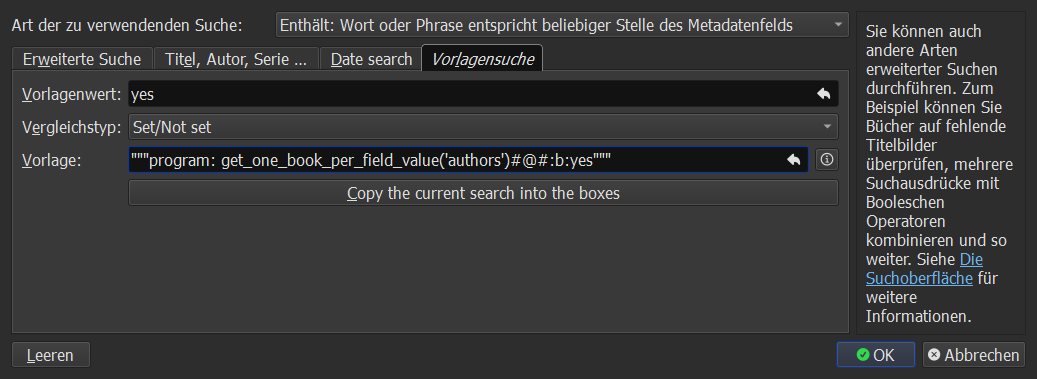 It calls the above stored template with the argument "authors". I recommend you create a saved search with it. I did and named it "one_book_per_author". You now have @Katja_hbg's B.