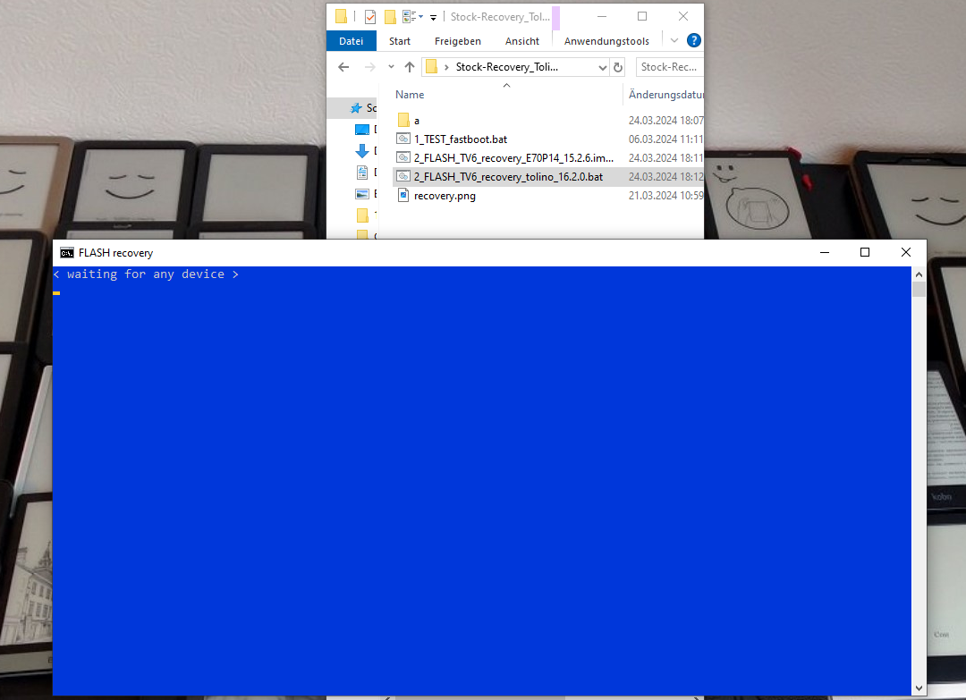 And you also cannot boot the device into recovery mode using hardware buttons? You can flash it in another way. https://mega.nz/file/fwchAQKR#AZ6mAx...mHBZ_P6U8na5Ow We connect Tolino to the PC. Turn off Tolino by holding the power-button for 10 - 15 seconds. Click 2_FLASH_TV6_recovery_tolino_16.2.0.bat. Now use the buttons (bottom page turn button + power-button) to boot into fastboot until the command is executed. Next, disconnect the Tolino from the PC and, using a long press on the bottom page turn button + power-button reboot from the mode fastboot to recovery mode. Last edited by Waldy; 02-16-2025 at 06:04 AM. |
