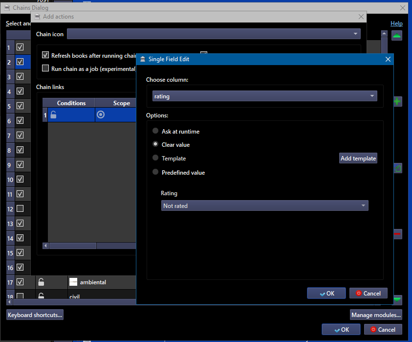 https://www.mobileread.com/forums/sh...postcount=1917 Automatic adding and converting are built-in Calibre features you can set in Preferences -> Adding Books. So, I think you'd need a chain only for steps 4 to 6. The step 5 ("Apply" font of choice), can't have a general solution that would work for all books, IMO. As for "Remove rating", this can be done easily, by adding to the Chain an action called "Single field edit", as shown below: To download metadata, you need to insert (Create) a new module after installing Action Chains plugin: https://www.mobileread.com/forums/sh...9&postcount=28 Then add an action called "Download metadata" as the first step in the chain. And you can also add an action to select metadata source, by installing the Quick Preferences plugin. |