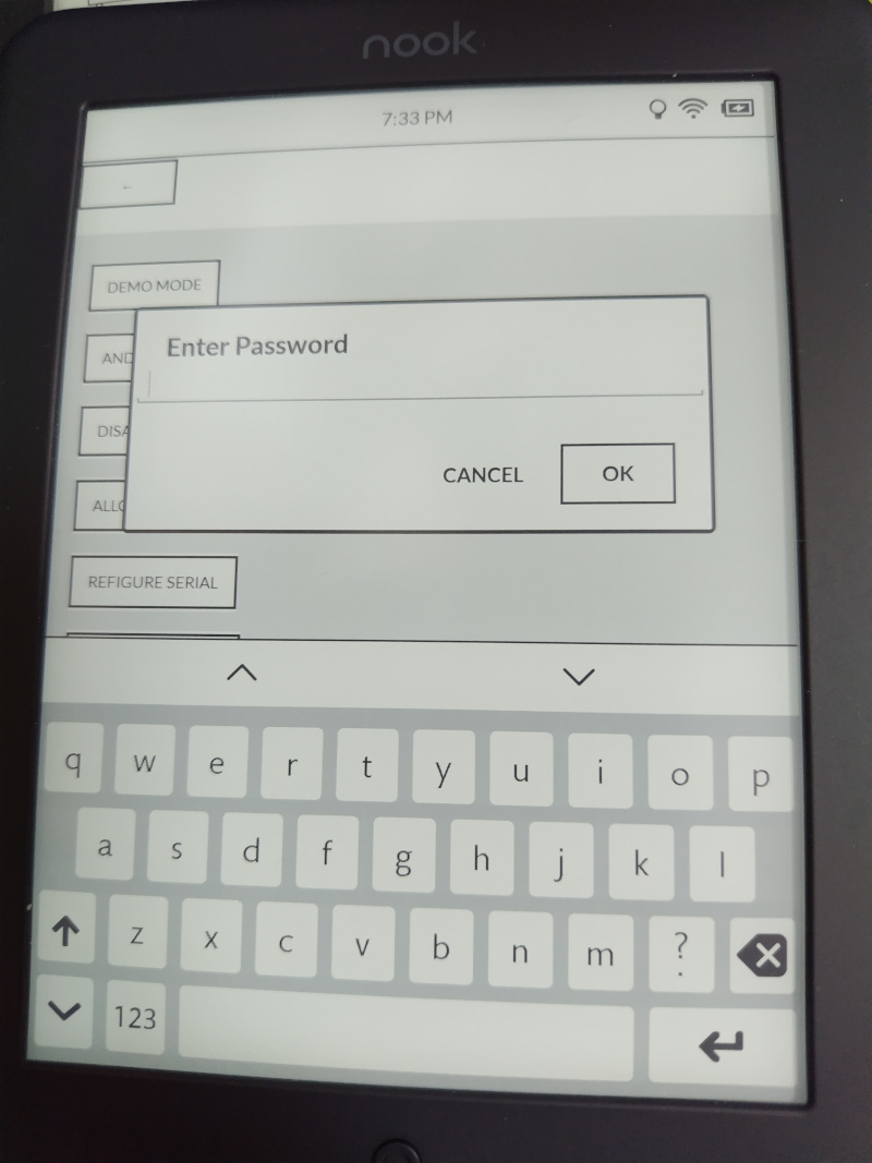 I reboot I turn on "Developer options", I turn on "USB debugging" It works fine. There is the standard popup asking me if I really want to. If somebody has a screenshot of when it's asking for a password. What/where is this "diagnostic app"? Aren't you doing this from the stock Settings? If you can't reach there from B&N land, just: Install a terminal program Code: