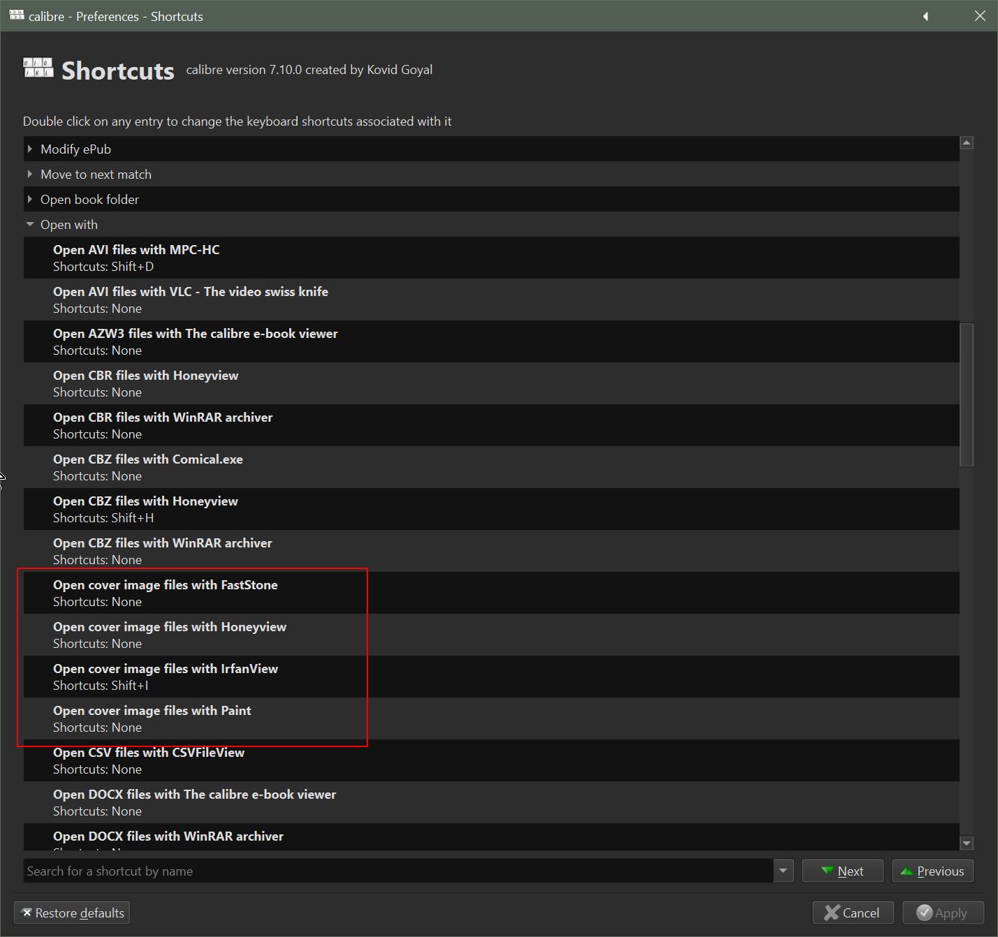 The calibre Open With feature inherits whatever you have in the Windows->File Explorer->Open With menu, ditto MacOS->Finder. BR |