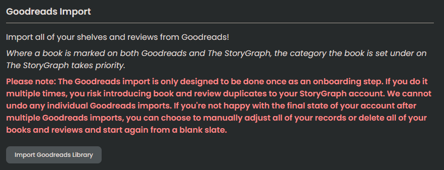 But. The reality is that Goodreads' database is much better than Storygraph's and the user interface is faster and more intuitive. And given that I've already got a useful friends' network there.... I ported my books to StoryGraph and I tried; for a while I maintained both accounts but that wasn't worth the nuisance. Goodreads for all its drawbacks is still better for my purposes. |