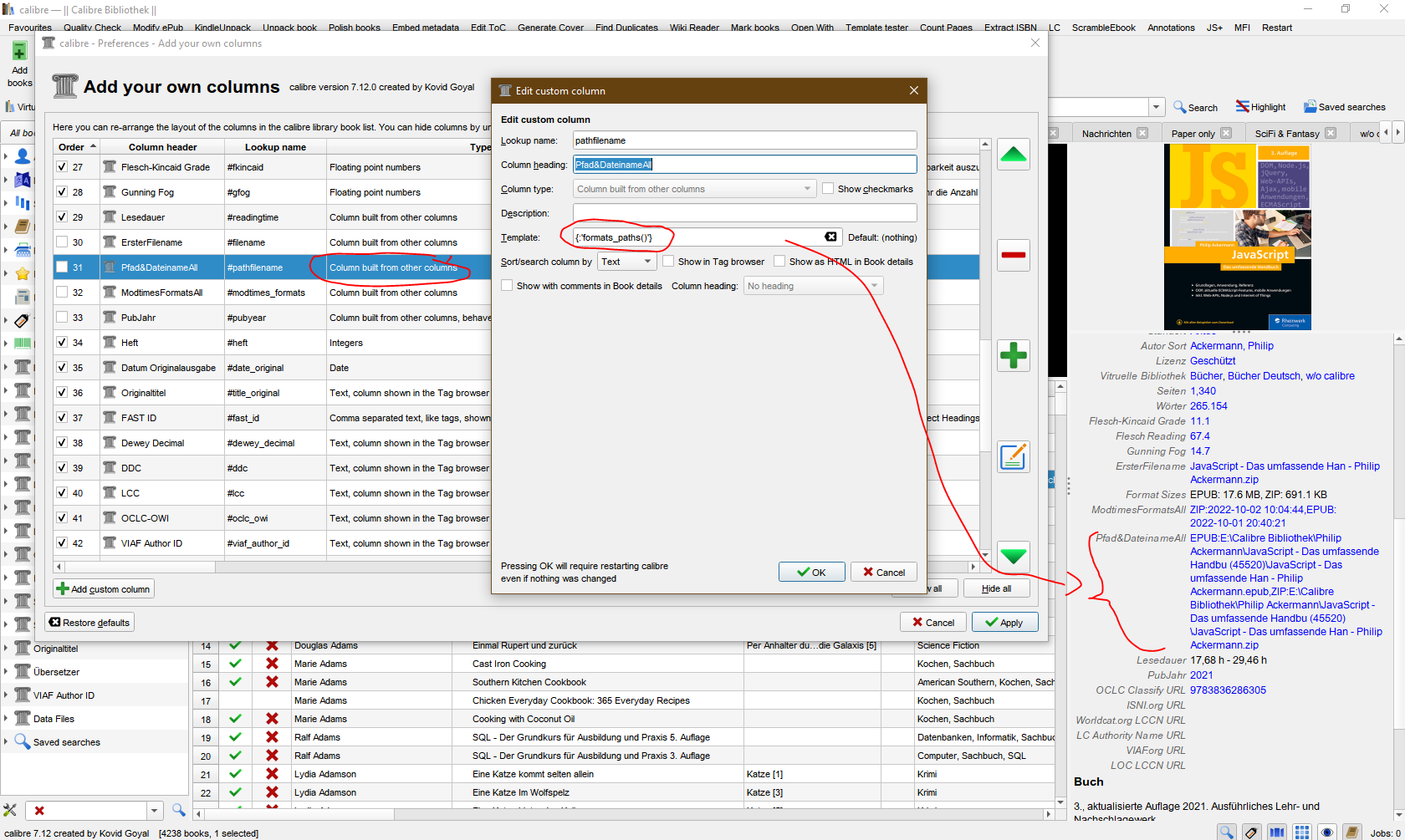 Lookup name: pathfilename Remark: Prints all file names in case there exists more then one file record for a book. Downside: Delays Calibre startup a little bit. I usually hide those kind of columns in the library view (w/o check mark for the column, see column #31) and show them only in the book details window as you can see in first picture attached.Column heading: Pfad&DateinameAll Column type: Column build from other columns Template: {:'formats_paths()'} You can now use this newly created column where ever you want, e.g. in the book details panel or with Catalog like shown in picture two and three Depending on for what you want to use it for this it is one possible solution. But Kovids solution is much better suited if you want to use the .csv file for further processing. |