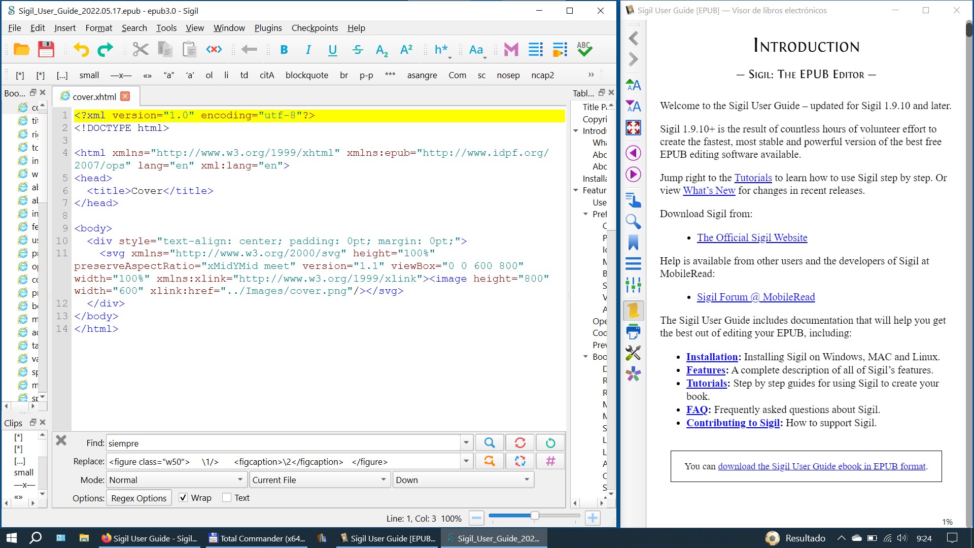 First of all I want to thank you for your generosity. And now I would like to comment on two small problems, not to complain but to collaborate, that I have found using the new version (with Windows 10). 1. If I close Sigil with a window width smaller than a certain size, when I open it again it appears with a certain width larger. There seems to be a minimum initial width, about two thirds of my screen width, in my case. 2. One thing I could do before and now it doesn't work: Select a text, for example "ALBERT EINSTEIN" (quotation marks not included). Click the button [Aa]->Ab Titlecase. The text is converted to "Albert Einstein" and remains selected. Now I click on a custom button of mine that applies the following to the selection: Code: <span class="small-caps">\1</span> What I mean is that with the previous version, the span defined in the custom button, or the bold, or the italic, was applied to the selected text.   |