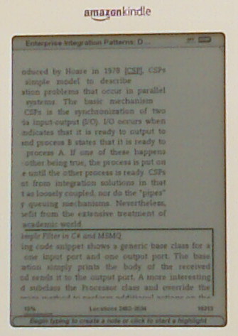 I've had my Kindle 2 for a few weeks and just ran into a formatting problem with the book "Enterprise Integration Patterns". About three chapters into the book, I noticed that some of the text was flowing off the screen and couldn't be read. After some experimenting, I found ...