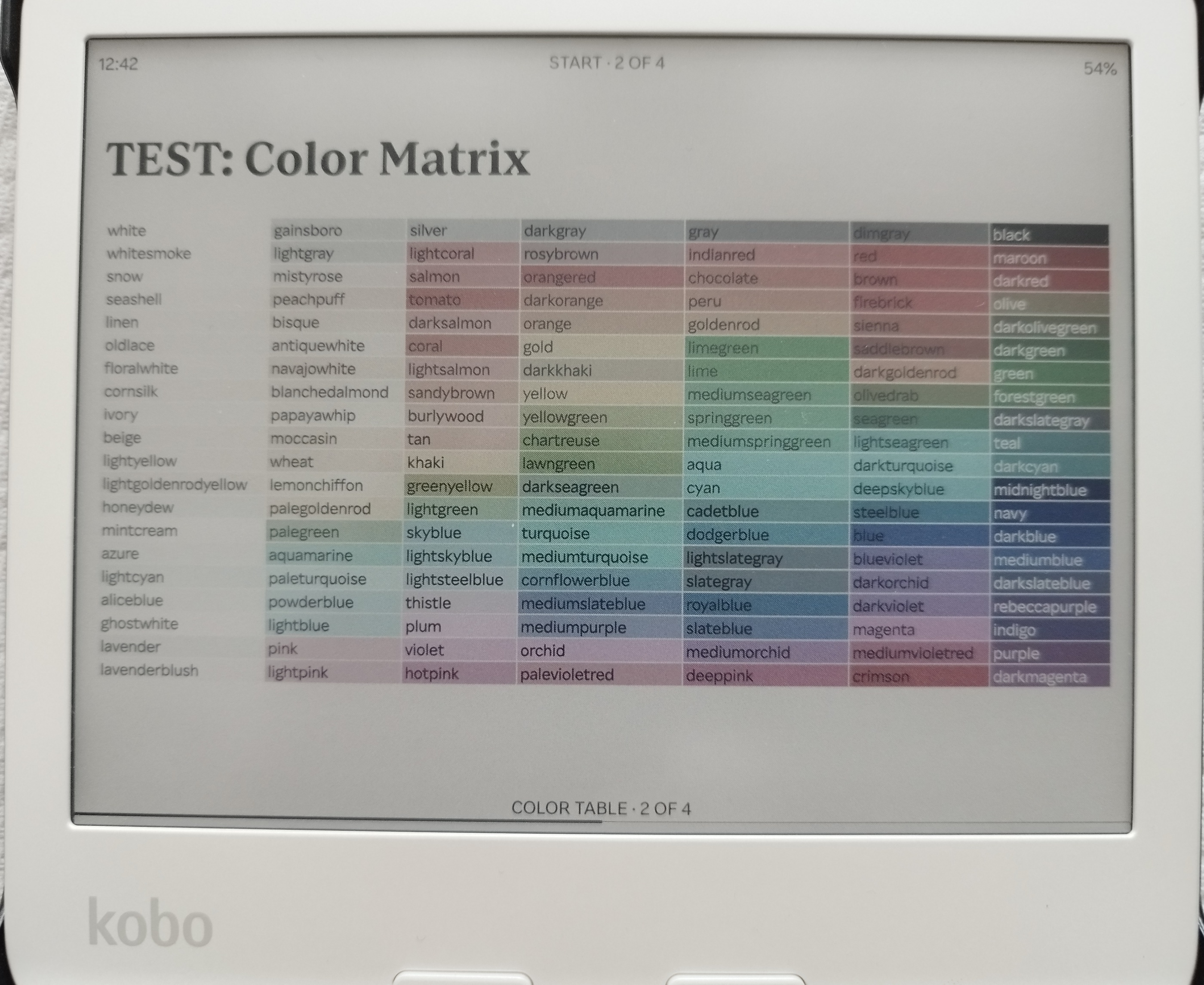 Attached: Photo someone here shared of Kobo with Kaleido 3. What the source is (how it looks depends on what you are using) Three test patterns for CRT / LCD / OLED / LED / QLED / Plasma displays. All are just regular PC 16.7M colour, none are HDR. |