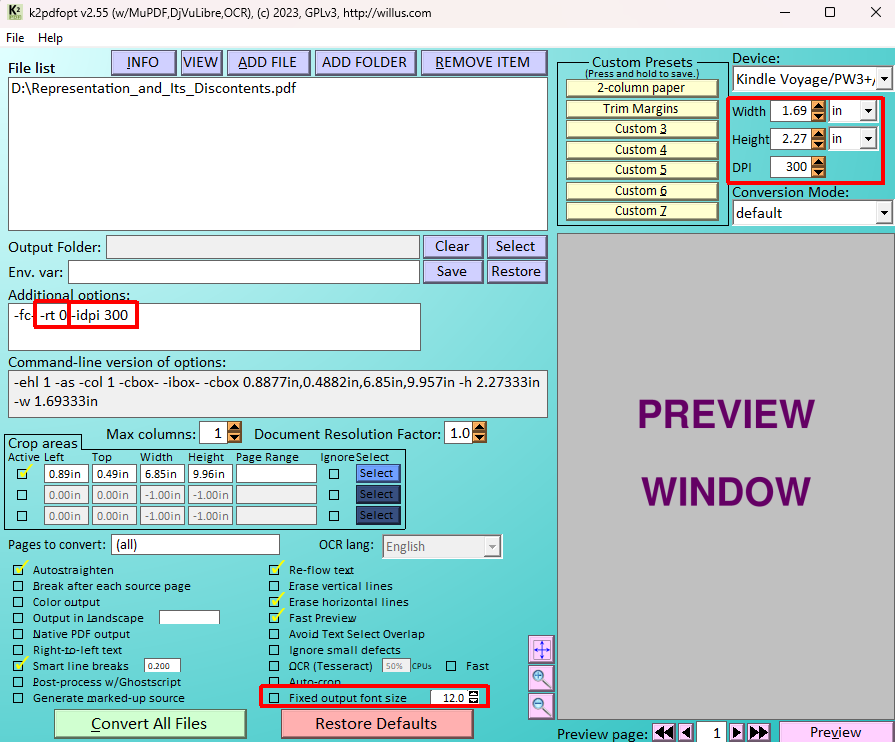 Conversion #1 See k2pdfopt_window.png and cropregion_window.png attachments. Here I tried to stay as close to your options as possible 1. I selected a crop region to ignore the edges of the page. 2. I selected "Erase horizontal lines" to ignore the divider lines on some of the pages. 3. I de-selected auto-crop. That's really meant to be for poorly scanned books that have photocopying artifacts at the edges of the pages. It doesn't work very well. 4. I set max columns to 1 just so k2pdfopt would not look for multiple columns 5. I put -fc- in the additional options box to suppress a warning message. It's also important that "Autostraighten" is selected. I set the font size to 18 points. I attached sample output to output_sample_18ptfont.pdf. The conversion was also pretty slow--200 s on my PC. See below for how I remedied that. Conversion #2 (k2pdfopt_window_faster.png and output_sample_faster.pdf) Here I made some changes to make the conversion faster and the output file smaller. Rather than setting the output font size, which is slow for a number of reasons (part of it that k2pdfopt has to analyze the file to determine the font size), I just tell k2pdfopt that your kindle window size is much smaller than it actually is. It seems strange, but this has the same effect, and k2pdfopt processes everything at a lower dpi, so it goes much faster and makes a smaller output file. Also, I set the input dpi to 300 dpi since that is the native resolution of the source file. Normally it defaults to twice the output dpi. Finally, I added "-rt 0" so k2pdfopt does not waste time verifying the orientation of the source file. This brought the conversion time down from 200 s to 45 s on my PC. The output file size is ~11 MB. Conversion #3 (k2pdfopt_window_fastest_and_smallest.png and output_sample_fastest_and_smallest.pdf) I added -bpc 1 to the additional options since the source document is just a monochrome (1-bit) document. This gets the output down to ~7 MB from an original size of ~20 MB in conversion #1. Last edited by willus; 08-11-2024 at 10:00 AM. |