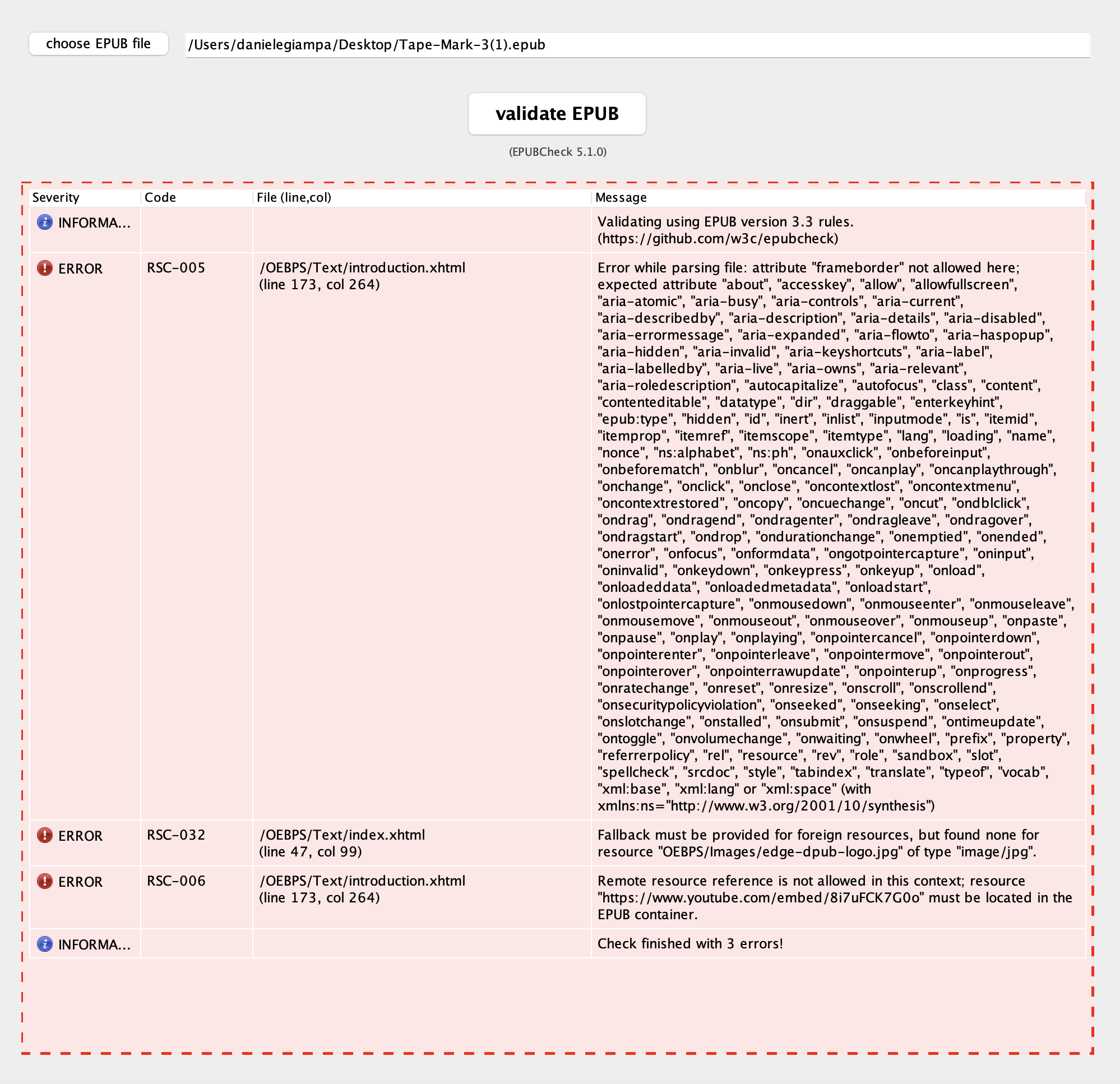 I have a question about a video that I embedded in the introduction of my EPUB3 ebook "Tape Mark 3": https://edgedpub.com/sample_work_6.php The EPUB-Checker shows me 2 errors (see attachment) that are related to the video on line 173 of the file introduction.xhtml. <div> <iframe width="560" height="315" src="https://www.youtube.com/embed/8i7uFCK7G0o" title="YouTube video player" frameborder="0" allow="accelerometer; autoplay; clipboard-write; encrypted-media; gyroscope; picture-in-picture; web-share" allowfullscreen=""></iframe> </div> I looked for explanations about Error RSC-006 regarding the EPUB container. On the web page Anatomy of an EPU3 file I read that the file container.xml is in the folder META-INF. I have 3 questions: 1) Is there a problem with the iframe? 2) What does it mean that I have to "locate the resource in the EPUB container"? 3) How do I insert the video in the manifest? How do I write this line of code for the video? <item id="..." href="..." media-type="video/..."/> Thank you for your help. Daniele |