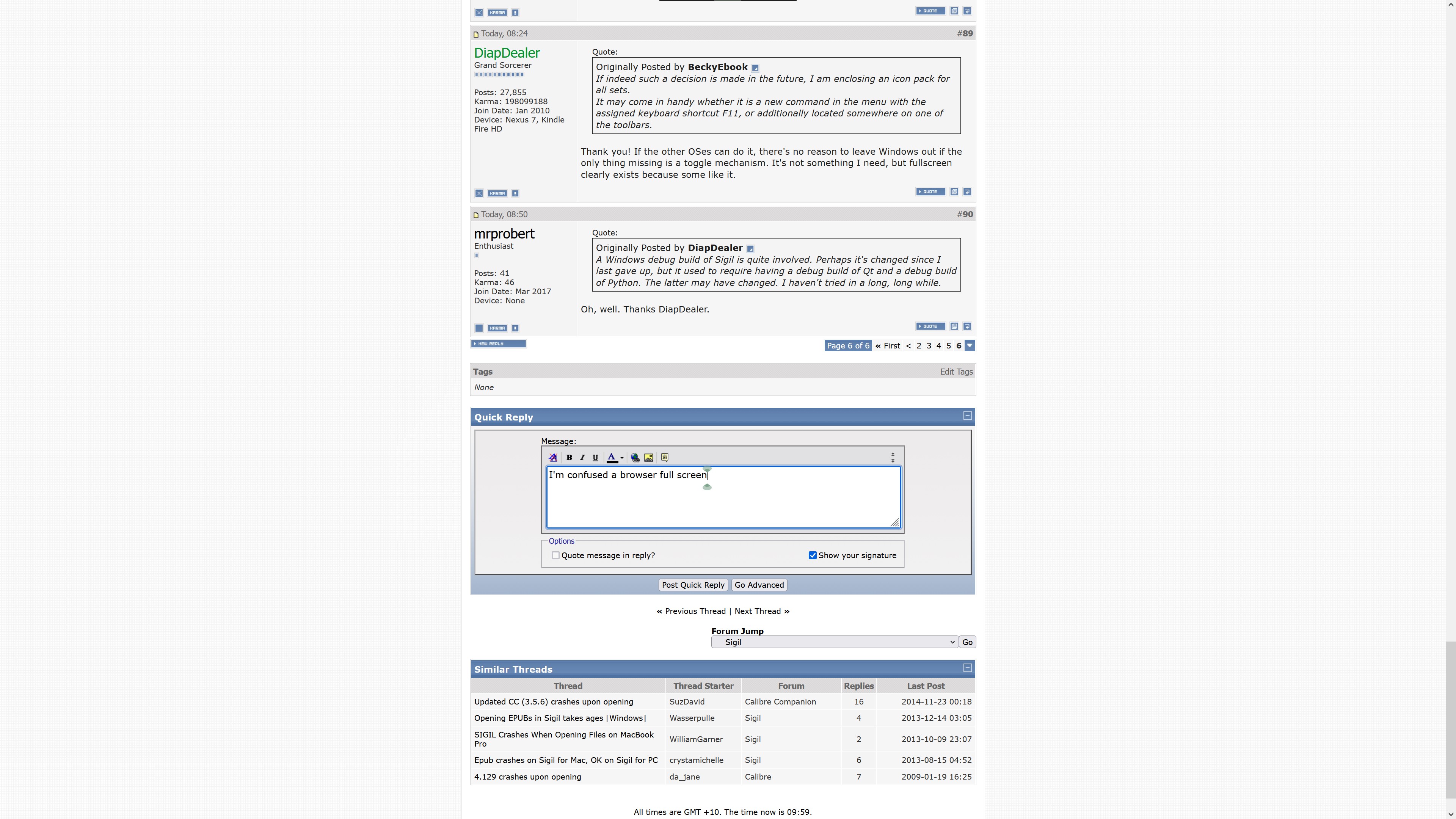 ![]() @BeckyEbook posted some screenshots a while back, and I'm looking at Sigil in fullscreen on Linux right now. It loses its titlebar and hides a taskbar if present. That's about it. Fullscreen and kiosk mode are not the same thing. You forgot to mention that it only makes sense to you (and me for the most part). But we all need to learn that our use cases are not nearly as "standard" as we might want to believe they are. We've given Sigil scads of features over the years that I have absolutely no use for. *shrug* Last edited by DiapDealer; 09-06-2024 at 09:09 AM. |
