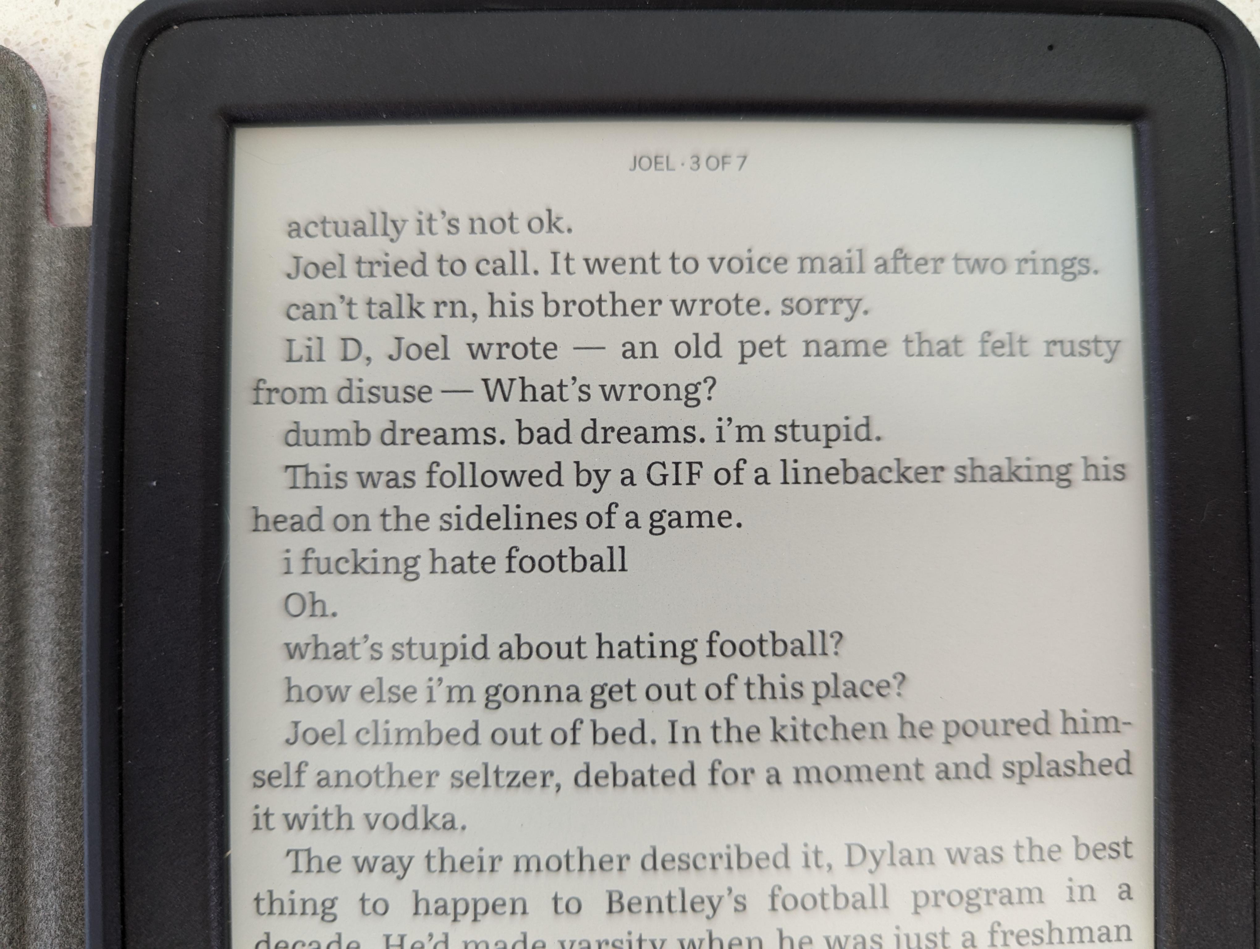 <p class="body-text"><span class="ef"><span class="koboSpan" id="kobo.24.1">actually it’s not ok.</span></span></p> <p class="body-text"><span class="koboSpan" id="kobo.25.1">Joel tried to call. </span><span class="koboSpan" id="kobo.25.2">It went to voice mail after two rings.</span></p> <p class="body-text"><span class="ef"><span class="koboSpan" id="kobo.26.1">can’t talk rn</span></span><span class="koboSpan" id="kobo.27.1">, his brother wrote. </span><span class="ef"><span class="koboSpan" id="kobo.28.1">sorry.</span></span></p> <p class="body-text"><span class="ef"><span class="koboSpan" id="kobo.29.1">Lil D</span></span><span class="koboSpan" id="kobo.30.1">, Joel wrote — an old pet name that felt rusty from disuse — </span><span class="ef"><span class="koboSpan" id="kobo.31.1">What’s wrong?</span></span></p> <p class="body-text"><span class="ef"><span class="koboSpan" id="kobo.32.1">dumb dreams. </span><span class="koboSpan" id="kobo.32.2">bad dreams. </span><span class="koboSpan" id="kobo.32.3">i’m stupid.</span></span></p> Code: