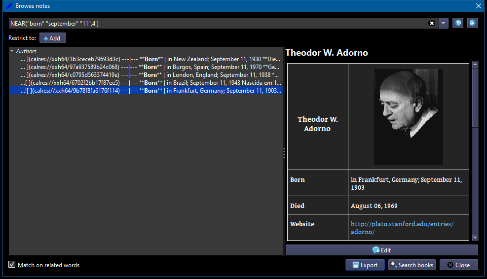 Currently the way I see to do it is using the Notes Browser with its FTS-like search syntax, like this: In that example I've searched for authors born in 9/11. Default shortcut is Ctrl + Shift + N. However I can't tell how to bring all results from that search into "main Calibre", so that I could bulk add the "Born in 9/11" tag, for instance. |