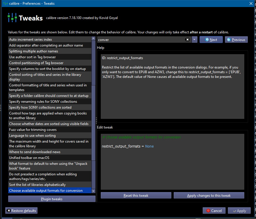 After the last two Calibre updates, I can no longer set DOCX as a permanent output choice. Calibre seems to be stuck on epub as an output. I can change the output type in the window after selecting the book and selecting Convert Books. In the first window that appears I can switch to DOCX as output before clicking OK but cannot seem to change it in the input/output window under preferences. Any ideas on how to circumvent this. I'm running Sequoia and using Calibre 7.18. The problem existed under the previous MacOS as well. The problem seemed to start after the Calibre update. Thanks for any information.