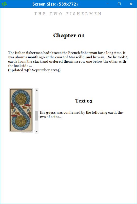 I have been playing a little with the animation, and I am afraid there are still two issues. 1) I have a hard time finding the right size for the card box. It is always either too high or too small. 2) The texts linked to each card don't appear when scrolling. I can scroll the part with the cards and the texts, but they don't move simultaneously. The idea behind this work is that the cards generate text related to it. The various texts should, therefore, be invisible and only turn visible when the respective card appears in the card box. I have uploaded the latest version of this work on my web page https://edgedpub.com/sample_work_7.php Many thanks for your help. Daniele |
