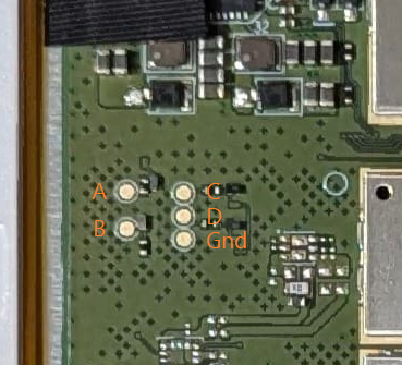 C, D, Gnd are your UART. Whichever C or D measures 1.8V is TX, the other is RX. A, B are your EDL test points. Normally (and only if I am right) could you short them together. It's better to play safe. Measure the voltage, one is 1.8V the other is 0V. Put your DVM in diode test, black to a "sardine can", red to the 0V A or B, long power button press with USB connected. |