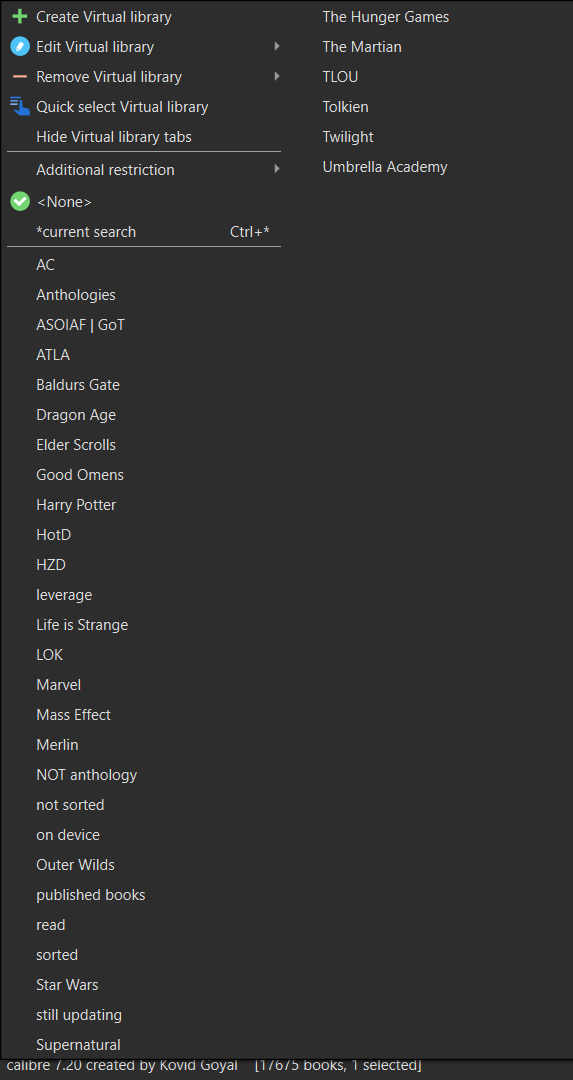 I have seventeen. Four for reading status: Currently Reading (includes the immediate TBR list), Pile of Shame (yearly backlog), Unread, and Read. I have five more for the type of book: Fiction, Fanfiction, Nonfiction, Magazines & Publications, and Documentation & Manuals. I used to have one for Comics, but later merged it (first into magazines, then into fiction). Then I have: - Series - eBooks - Physical Books - Purchases - Loans (I don't keep the books myself, just records) - On Device Then the last two are Recently Added (in the last 30 days) and Cleanup (mostly used as intake, but sometimes older books get flagged and end up here until I fix various issues). A lot of my VLs also have an associated View Manager views because I use a lot of custom columns for different purposes: |