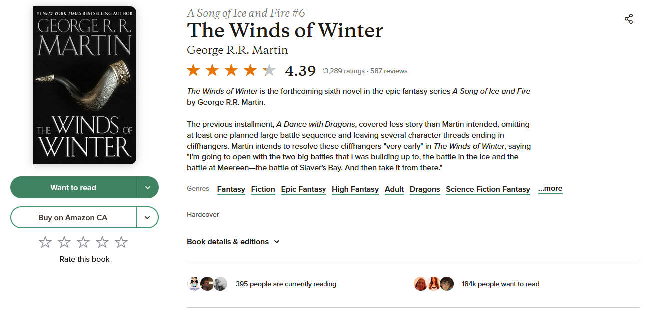Then I made the mistake of looking at the page for The Wind of Winter (A Song of Ice and Fire volume 6). The attached image pretty much says it all. 395 people are currently reading and it has 8007 5 star reviews and 3589 4 star reviews.