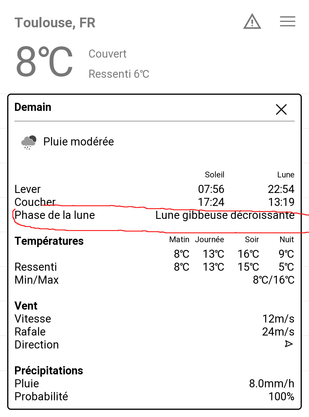 Works on my Vivlio Light HD Color (6.8.3870). Dark mode works well, but I haven't seen the moon phases or the new dialog box. The weather alerts from Météo France are in English, but I guess that's the OpenWhether data source. The off screen logo option doesn't work for me. For a future version, some colored pictograms would be welcome... |