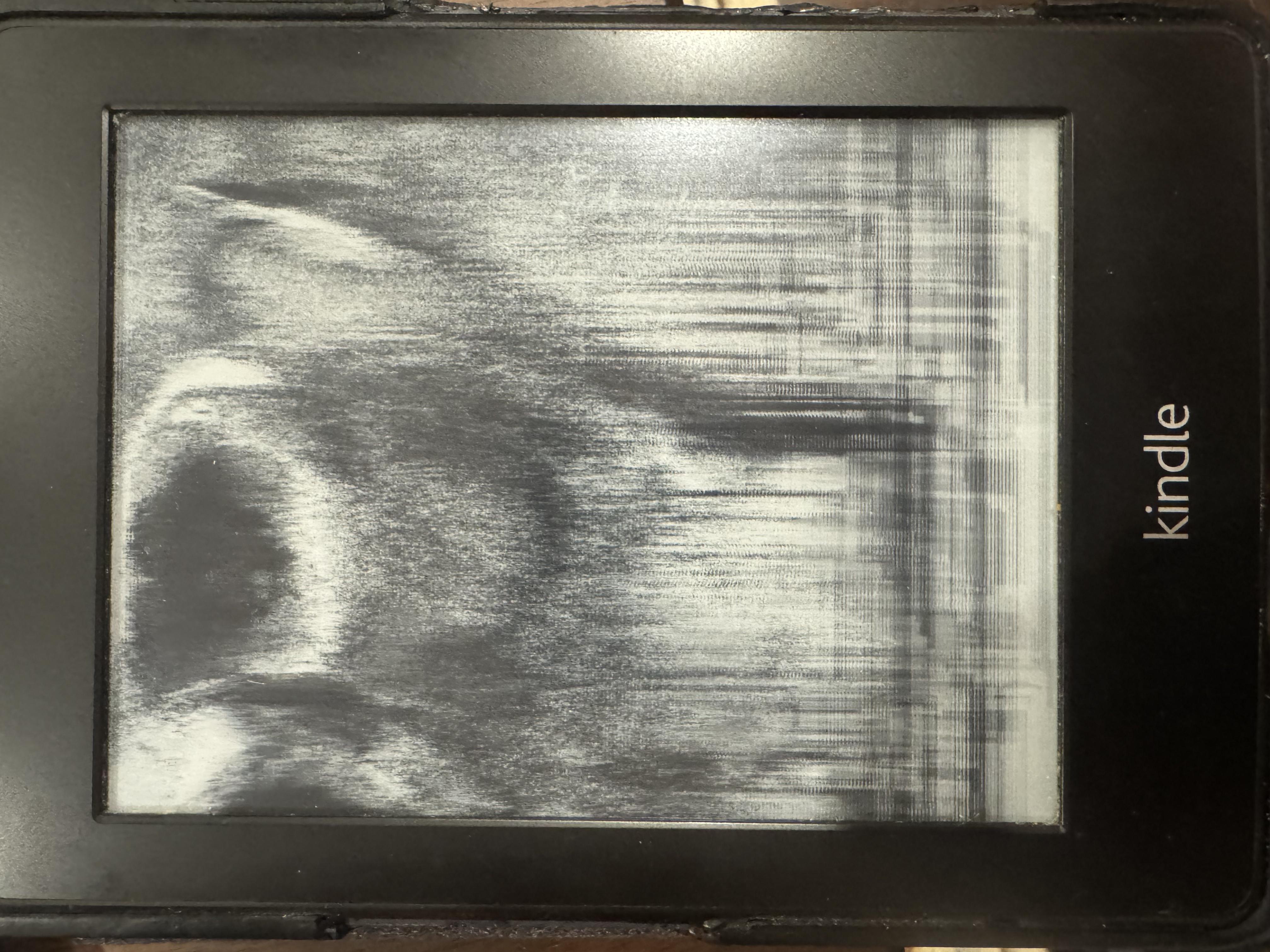 My Kindle PW1 display is acting up. I've attached pictures. At first I thought the display was broken, but after a reboot it worked fine until I plugged it into my Macbook to transfer some books. Now when I do a forced reboot by holding the power button it does a full screen refresh (a few full black and then full white flashes) and then shows the startup screen just briefly before it goes wonky again. This appears to be a software issue, but I'm not sure what, nor why it worked briefly.
