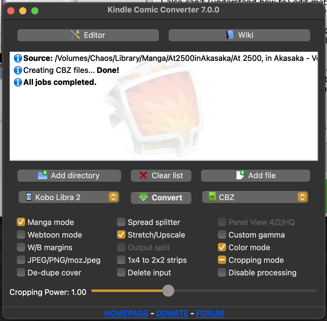 Warning: sorry for the long post and highly-possible silly mistakes. ![]() I'll walk you through everything I have done so far, I would love to get your feedback on the step-by-step workflow and explanation for my in-experienced one brain cell T_T (psst... please explain like I'm 5yo, and thank you so much for your patience) Some details on what I have/use: - Main Device: Kobo Libra 2 that I got exactly 2 years ago in 2022 (factory settings + a Vietnamese font update so that my Vietnamese book-titles can show in the main interface. I don't have KOreader... I am baby...) - Computer: Apple desktop M1 macOS 15.1.1 - Apps I downloaded yesterday: KCC 7.0.0; and a few things I also got bc my rabbit-hole research said they might be helpful(?): Calibre (no additional plugins or anything), ComicTagger. what-I-did Walkthrough: First Try So yesterday, I downloaded and installed KCC 7.0.0 for the first time. I also (through idiot-proof youtube videos) downloaded and installed Homebrew for 7zip. Then Calibre and ComicTagger. I then gathered all the images for the manga pages into a folder (I just bulk download the images from a manga website that has the series I want). I followed the Set Up structure from the Metadata KCC wiki page (example attached below - 'FolderStructure') My outermost folder is the Title > Volumes (3 in total) > Chapters (per volume) > Manga pages JPEGs In KCC, with the Setup attached, I add directory and picked the title folder. Had my Device as Kobo Libra 2 and format as CBZ, I hit 'Convert' and huzah! A .cbz file named (At 2500, in Akasaka - Volume 1-3.cbz). I go back to the KCC Editors, load up the newly created cbz to add the Series name and Writer for the metadata. I then manually drop into my Kobo via USB. Result: yay! first time reading manga on Kobo! All the images shows up, no weird sizing, crops, or missing pages! Roadblocks I ran into: Second Try